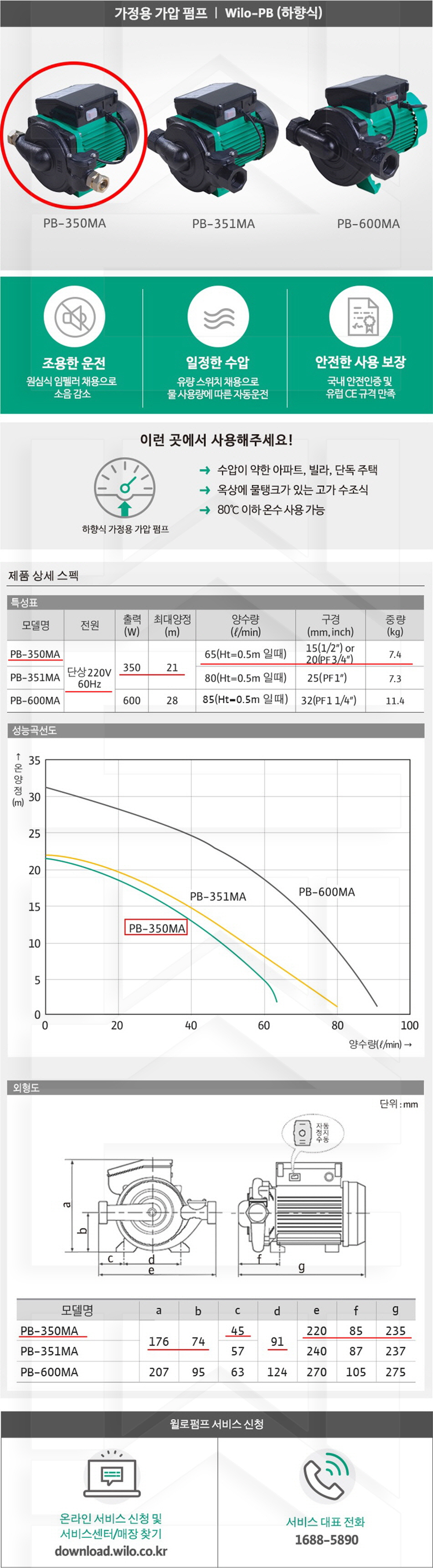 100-11-11-00000350 가압용, 하향식 PB-350MA 판매가 233,000 ~ 원 배송방법 일반배송 브랜드 제조사 윌로펌프 주식회사 상품옵션 품명 옵션코드 규격 중량 판매단위 회원가 수량 PB-350MA 100-11-11-00000350 20A 7.4kg (7,400g) 0 233,000원 - + PB-351MA 100-11-11-00000351 25A 7.3kg (7,300g) 0 233,000원 - + PB-600MA 100-11-11-00000600 32A 11.4kg (11,400g) 0 372,000원 - + 총 상품 금액(VAT포함) 원 회원 / 비회원 구매하기 상품담기 제품상세정보 상품문의 (0) 배송 안내 반품/교환 안내 가정용 가압 펌프 하향식 상품 문의하기 배송안내 배송 안내 일반제품 당일 1시 이전 주문시 재고 여부에 따라 당일발송 재고 부족시 2~3일 소요 파손위험제품 (화물택배/차량배송) 파손위험이 큰 제품은 빠렛트로 포장되어 차량으로 이동됩니다. 고객님이 지정한 장소와 가장 가까운 차량접근이 가능한 도로까지만 배송 주문물량 및 제품의 특성에 따라 화물, 화물택배. 합짐차량. 단독차량으로 고객님의 요청에 따라 운송 차량 지정 제품 하차시 파손이 있을 수 있으므로, 꼭 하차전 제품을 확인 고객센터 고객 센터 010-6539-7900 상담시간 오전 09시 ~ 오후 6시 점심 : 12:00 ~ 13:00 / 휴일 : 토, 일요일, 공휴일 반품/교환 안내 제품의 하자 및 오배송은 문의 주시면 즉시 처리해드리겠습니다. 반품/교환 판매자 지정택배사 : CJ대한통운 반품배송비(편도) : 3,000원 교환배송비(왕복) : 6,000원 보내실 곳 : 전라북도 전주시 완산구 콩쥐팥쥐로 1570 * 반품/교환 사유에 따른 요청 가능 기간 구매자 단순 변심 : 상품수령후 7일이내(구매자 반품 배송비 부담) 반품/교환 불가능 사유 교환/반품 요청 기간이 지난 경우 소비자의 책임 있는 사유로 상품 등이 분실/파손/훼손된 경우 소비자의 사용/소비에 의해 상품 등의 가치가 현저히 감소한 경우 제품을 설치 또는 장착하였을 경우 주문제작 상품중 상품제작에 들어간 경우 제품을 하차 또는 시공 후의 공정과정에서 일어난 파손의 경우 교환 반품시 고객 부담 배송비를 지불하지 아니한 경우 * 펌프제품은 미사용, 포장박스 미훼손 시에만 교환/반품이 가능합니다. 고객센터 고객 센터 010-6539-7900 상담시간 오전 09시 ~ 오후 6시 점심 : 12:00 ~ 13:00 / 휴일 : 토, 일요일, 공휴일