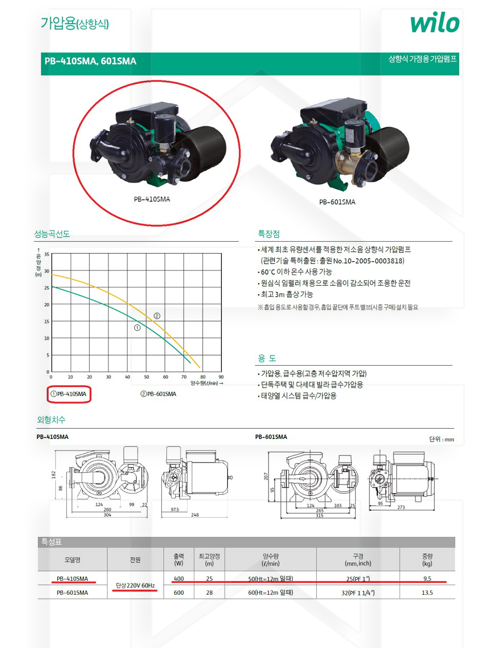 100-11-12-00000410 가압용, 상향식 PB-410SMA 판매가 330,000 ~ 원 배송방법 일반배송 브랜드 제조사 윌로펌프 주식회사 상품옵션 품명 옵션코드 규격 중량 판매단위 회원가 수량 PB-410SMA 100-11-12-00000410 25A 9.5kg (9,500g) 0 330,000원 - + PB-601SMA 100-11-12-00000601 32A 13.5kg (13,500g) 0 424,000원 - + 총 상품 금액(VAT포함) 원 회원 / 비회원 구매하기 상품담기 제품상세정보 상품문의 (0) 배송 안내 반품/교환 안내 급수 가압펌프 상향식 상품 문의하기 배송안내 배송 안내 일반제품 당일 1시 이전 주문시 재고 여부에 따라 당일발송 재고 부족시 2~3일 소요 파손위험제품 (화물택배/차량배송) 파손위험이 큰 제품은 빠렛트로 포장되어 차량으로 이동됩니다. 고객님이 지정한 장소와 가장 가까운 차량접근이 가능한 도로까지만 배송 주문물량 및 제품의 특성에 따라 화물, 화물택배. 합짐차량. 단독차량으로 고객님의 요청에 따라 운송 차량 지정 제품 하차시 파손이 있을 수 있으므로, 꼭 하차전 제품을 확인 고객센터 고객 센터 010-6539-7900 상담시간 오전 09시 ~ 오후 6시 점심 : 12:00 ~ 13:00 / 휴일 : 토, 일요일, 공휴일 반품/교환 안내 제품의 하자 및 오배송은 문의 주시면 즉시 처리해드리겠습니다. 반품/교환 판매자 지정택배사 : CJ대한통운 반품배송비(편도) : 3,000원 교환배송비(왕복) : 6,000원 보내실 곳 : 전라북도 전주시 완산구 콩쥐팥쥐로 1570 * 반품/교환 사유에 따른 요청 가능 기간 구매자 단순 변심 : 상품수령후 7일이내(구매자 반품 배송비 부담) 반품/교환 불가능 사유 교환/반품 요청 기간이 지난 경우 소비자의 책임 있는 사유로 상품 등이 분실/파손/훼손된 경우 소비자의 사용/소비에 의해 상품 등의 가치가 현저히 감소한 경우 제품을 설치 또는 장착하였을 경우 주문제작 상품중 상품제작에 들어간 경우 제품을 하차 또는 시공 후의 공정과정에서 일어난 파손의 경우 교환 반품시 고객 부담 배송비를 지불하지 아니한 경우 * 펌프제품은 미사용, 포장박스 미훼손 시에만 교환/반품이 가능합니다. 고객센터 고객 센터 010-6539-7900 상담시간 오전 09시 ~ 오후 6시 점심 : 12:00 ~ 13:00 / 휴일 : 토, 일요일, 공휴일