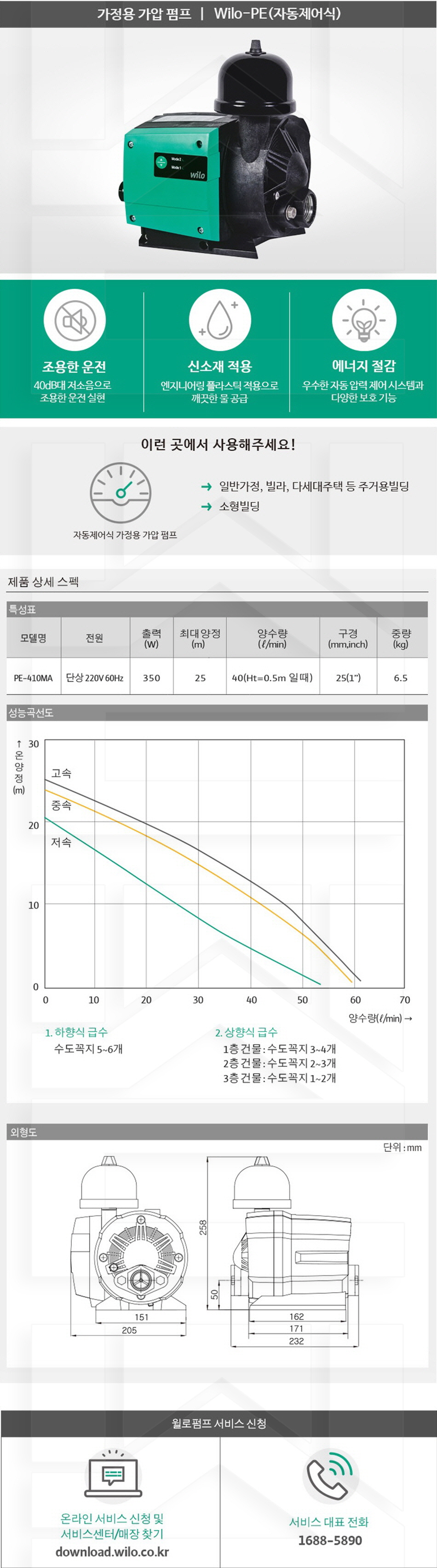 100-11-15-00000410 가압용, 자동제어식, 구PE-400MA PE-410MA 판매가 357,000 원 배송방법 일반배송 브랜드 제조사 윌로펌프 주식회사 상품옵션 품명 옵션코드 규격 중량 판매단위 회원가 수량 PE-410MA 100-11-15-00000410 25A 6.5kg (6,500g) 0 357,000원 - + 총 상품 금액(VAT포함) 원 회원 / 비회원 구매하기 상품담기 제품상세정보 상품문의 (0) 배송 안내 반품/교환 안내 가정용 가압 펌프 자동제어식 상품 문의하기 배송안내 배송 안내 일반제품 당일 1시 이전 주문시 재고 여부에 따라 당일발송 재고 부족시 2~3일 소요 파손위험제품 (화물택배/차량배송) 파손위험이 큰 제품은 빠렛트로 포장되어 차량으로 이동됩니다. 고객님이 지정한 장소와 가장 가까운 차량접근이 가능한 도로까지만 배송 주문물량 및 제품의 특성에 따라 화물, 화물택배. 합짐차량. 단독차량으로 고객님의 요청에 따라 운송 차량 지정 제품 하차시 파손이 있을 수 있으므로, 꼭 하차전 제품을 확인 고객센터 고객 센터 010-6539-7900 상담시간 오전 09시 ~ 오후 6시 점심 : 12:00 ~ 13:00 / 휴일 : 토, 일요일, 공휴일 반품/교환 안내 제품의 하자 및 오배송은 문의 주시면 즉시 처리해드리겠습니다. 반품/교환 판매자 지정택배사 : CJ대한통운 반품배송비(편도) : 3,000원 교환배송비(왕복) : 6,000원 보내실 곳 : 전라북도 전주시 완산구 콩쥐팥쥐로 1570 * 반품/교환 사유에 따른 요청 가능 기간 구매자 단순 변심 : 상품수령후 7일이내(구매자 반품 배송비 부담) 반품/교환 불가능 사유 교환/반품 요청 기간이 지난 경우 소비자의 책임 있는 사유로 상품 등이 분실/파손/훼손된 경우 소비자의 사용/소비에 의해 상품 등의 가치가 현저히 감소한 경우 제품을 설치 또는 장착하였을 경우 주문제작 상품중 상품제작에 들어간 경우 제품을 하차 또는 시공 후의 공정과정에서 일어난 파손의 경우 교환 반품시 고객 부담 배송비를 지불하지 아니한 경우 * 펌프제품은 미사용, 포장박스 미훼손 시에만 교환/반품이 가능합니다. 고객센터 고객 센터 010-6539-7900 상담시간 오전 09시 ~ 오후 6시 점심 : 12:00 ~ 13:00 / 휴일 : 토, 일요일, 공휴일