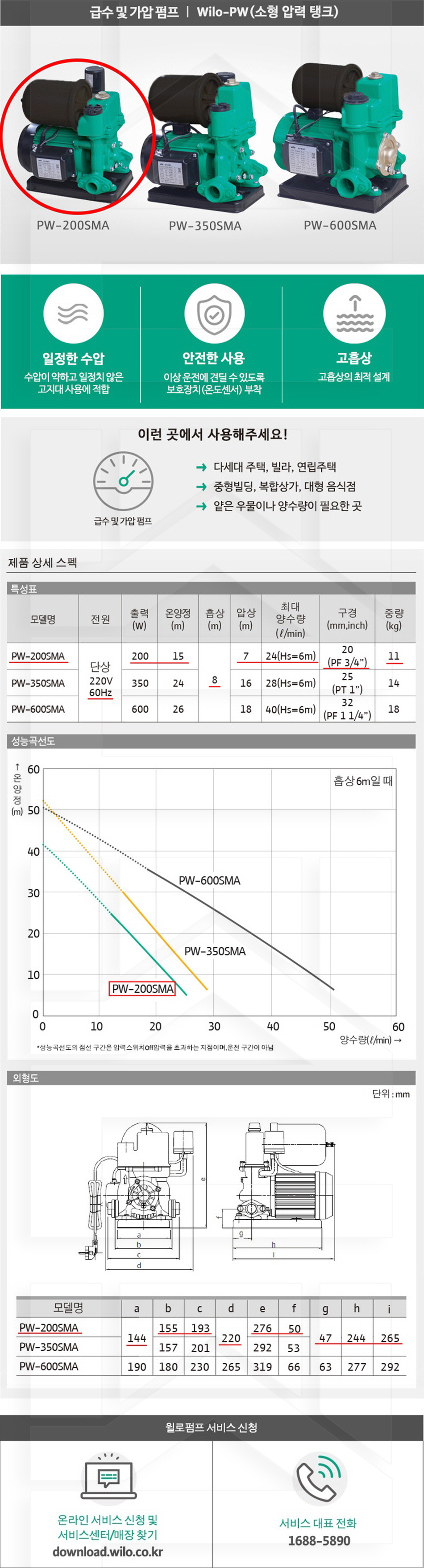 100-12-11-00000200 가정용소형, 자동식소형압력탱크 PW-200SMA 판매가 203,000 ~ 원 배송방법 일반배송 브랜드 제조사 윌로펌프 주식회사 상품옵션 품명 옵션코드 규격 중량 판매단위 회원가 수량 PW-200SMA 100-12-11-00000200 20A 11.0kg (11,000g) 0 203,000원 - + PW-350SMA 100-12-11-00000350 25A 14.0kg (14,000g) 0 241,000원 - + PW-600SMA 100-12-11-00000600 32A 18.0kg (18,000g) 0 326,000원 - + 총 상품 금액(VAT포함) 원 회원 / 비회원 구매하기 상품담기 제품상세정보 상품문의 (0) 배송 안내 반품/교환 안내 급수 가압 펌프 소형 압력 탱크 상품 문의하기 배송안내 배송 안내 일반제품 당일 1시 이전 주문시 재고 여부에 따라 당일발송 재고 부족시 2~3일 소요 파손위험제품 (화물택배/차량배송) 파손위험이 큰 제품은 빠렛트로 포장되어 차량으로 이동됩니다. 고객님이 지정한 장소와 가장 가까운 차량접근이 가능한 도로까지만 배송 주문물량 및 제품의 특성에 따라 화물, 화물택배. 합짐차량. 단독차량으로 고객님의 요청에 따라 운송 차량 지정 제품 하차시 파손이 있을 수 있으므로, 꼭 하차전 제품을 확인 고객센터 고객 센터 010-6539-7900 상담시간 오전 09시 ~ 오후 6시 점심 : 12:00 ~ 13:00 / 휴일 : 토, 일요일, 공휴일 반품/교환 안내 제품의 하자 및 오배송은 문의 주시면 즉시 처리해드리겠습니다. 반품/교환 판매자 지정택배사 : CJ대한통운 반품배송비(편도) : 3,000원 교환배송비(왕복) : 6,000원 보내실 곳 : 전라북도 전주시 완산구 콩쥐팥쥐로 1570 * 반품/교환 사유에 따른 요청 가능 기간 구매자 단순 변심 : 상품수령후 7일이내(구매자 반품 배송비 부담) 반품/교환 불가능 사유 교환/반품 요청 기간이 지난 경우 소비자의 책임 있는 사유로 상품 등이 분실/파손/훼손된 경우 소비자의 사용/소비에 의해 상품 등의 가치가 현저히 감소한 경우 제품을 설치 또는 장착하였을 경우 주문제작 상품중 상품제작에 들어간 경우 제품을 하차 또는 시공 후의 공정과정에서 일어난 파손의 경우 교환 반품시 고객 부담 배송비를 지불하지 아니한 경우 * 펌프제품은 미사용, 포장박스 미훼손 시에만 교환/반품이 가능합니다. 고객센터 고객 센터 010-6539-7900 상담시간 오전 09시 ~ 오후 6시 점심 : 12:00 ~ 13:00 / 휴일 : 토, 일요일, 공휴일