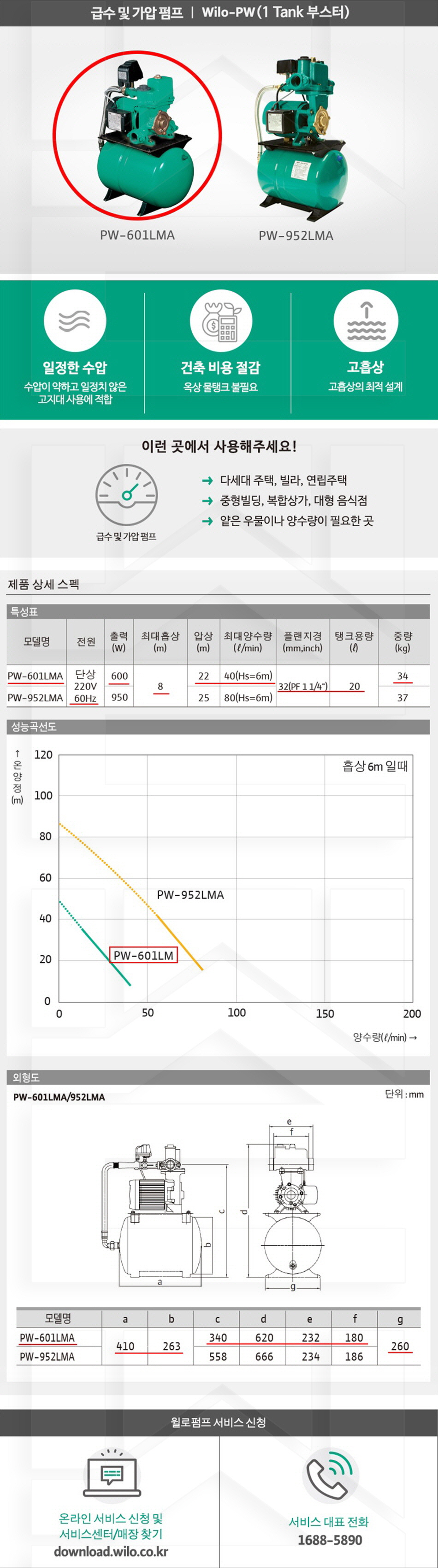 100-13-12-00000601 가압용 1tank 부스터, 고양정형 PW-601LMA 판매가 498,000 ~ 원 배송방법 일반배송 브랜드 제조사 윌로펌프 주식회사 상품옵션 품명 옵션코드 규격 중량 판매단위 회원가 수량 PW-601LMA 100-13-12-00000601 32A 34.0kg (34,000g) 0 498,000원 - + PW-952LMA/H 100-13-12-00000952 40A 37.0kg (37,000g) 0 643,000원 - + PW-2200MA 100-13-12-00002200 40A 52.0kg (52,000g) 0 1,459,000원 - + 총 상품 금액(VAT포함) 원 회원 / 비회원 구매하기 상품담기 제품상세정보 상품문의 (0) 배송 안내 반품/교환 안내 급수 가압 펌프 1Tank 부스터 상품 문의하기 배송안내 배송 안내 일반제품 당일 1시 이전 주문시 재고 여부에 따라 당일발송 재고 부족시 2~3일 소요 파손위험제품 (화물택배/차량배송) 파손위험이 큰 제품은 빠렛트로 포장되어 차량으로 이동됩니다. 고객님이 지정한 장소와 가장 가까운 차량접근이 가능한 도로까지만 배송 주문물량 및 제품의 특성에 따라 화물, 화물택배. 합짐차량. 단독차량으로 고객님의 요청에 따라 운송 차량 지정 제품 하차시 파손이 있을 수 있으므로, 꼭 하차전 제품을 확인 고객센터 고객 센터 010-6539-7900 상담시간 오전 09시 ~ 오후 6시 점심 : 12:00 ~ 13:00 / 휴일 : 토, 일요일, 공휴일 반품/교환 안내 제품의 하자 및 오배송은 문의 주시면 즉시 처리해드리겠습니다. 반품/교환 판매자 지정택배사 : CJ대한통운 반품배송비(편도) : 3,000원 교환배송비(왕복) : 6,000원 보내실 곳 : 전라북도 전주시 완산구 콩쥐팥쥐로 1570 * 반품/교환 사유에 따른 요청 가능 기간 구매자 단순 변심 : 상품수령후 7일이내(구매자 반품 배송비 부담) 반품/교환 불가능 사유 교환/반품 요청 기간이 지난 경우 소비자의 책임 있는 사유로 상품 등이 분실/파손/훼손된 경우 소비자의 사용/소비에 의해 상품 등의 가치가 현저히 감소한 경우 제품을 설치 또는 장착하였을 경우 주문제작 상품중 상품제작에 들어간 경우 제품을 하차 또는 시공 후의 공정과정에서 일어난 파손의 경우 교환 반품시 고객 부담 배송비를 지불하지 아니한 경우 * 펌프제품은 미사용, 포장박스 미훼손 시에만 교환/반품이 가능합니다. 고객센터 고객 센터 010-6539-7900 상담시간 오전 09시 ~ 오후 6시 점심 : 12:00 ~ 13:00 / 휴일 : 토, 일요일, 공휴일