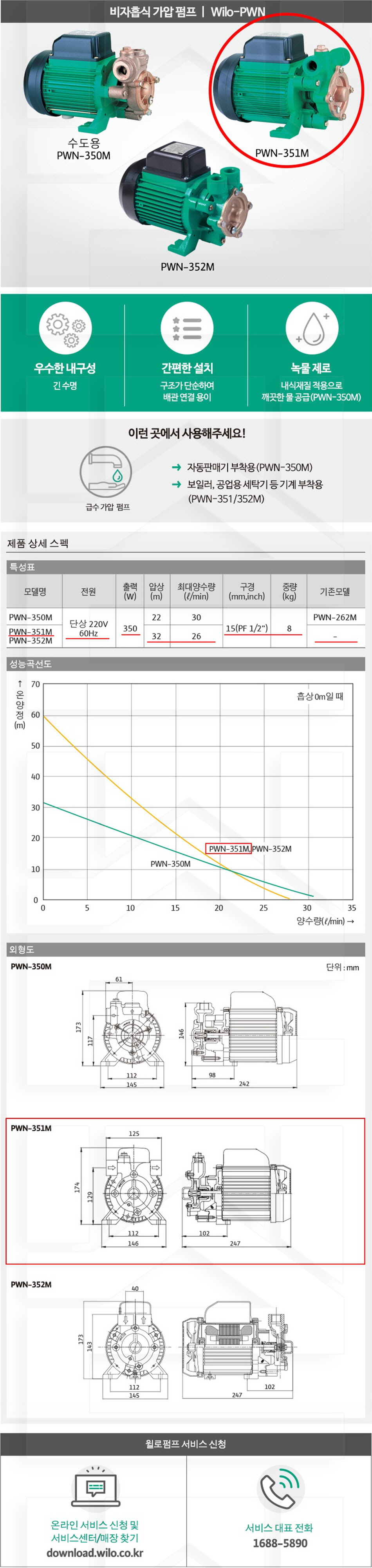 100-32-11-00000351 다목적용, 비자흡식가압펌프 PWN-351M 판매가 188,000 ~ 원 배송방법 일반배송 브랜드 제조사 윌로펌프 주식회사 상품옵션 품명 옵션코드 규격 중량 판매단위 회원가 수량 PWN-350M 100-32-11-00000350 15A 8.0kg (8,000g) 0 221,000원 - + PWN-351M 100-32-11-00000351 15A 8.0kg (8,000g) 0 188,000원 - + 총 상품 금액(VAT포함) 원 회원 / 비회원 구매하기 상품담기 제품상세정보 상품문의 (0) 배송 안내 반품/교환 안내 비자흡식 가압 펌프 상품 문의하기 배송안내 배송 안내 일반제품 당일 1시 이전 주문시 재고 여부에 따라 당일발송 재고 부족시 2~3일 소요 파손위험제품 (화물택배/차량배송) 파손위험이 큰 제품은 빠렛트로 포장되어 차량으로 이동됩니다. 고객님이 지정한 장소와 가장 가까운 차량접근이 가능한 도로까지만 배송 주문물량 및 제품의 특성에 따라 화물, 화물택배. 합짐차량. 단독차량으로 고객님의 요청에 따라 운송 차량 지정 제품 하차시 파손이 있을 수 있으므로, 꼭 하차전 제품을 확인 고객센터 고객 센터 010-6539-7900 상담시간 오전 09시 ~ 오후 6시 점심 : 12:00 ~ 13:00 / 휴일 : 토, 일요일, 공휴일 반품/교환 안내 제품의 하자 및 오배송은 문의 주시면 즉시 처리해드리겠습니다. 반품/교환 판매자 지정택배사 : CJ대한통운 반품배송비(편도) : 3,000원 교환배송비(왕복) : 6,000원 보내실 곳 : 전라북도 전주시 완산구 콩쥐팥쥐로 1570 * 반품/교환 사유에 따른 요청 가능 기간 구매자 단순 변심 : 상품수령후 7일이내(구매자 반품 배송비 부담) 반품/교환 불가능 사유 교환/반품 요청 기간이 지난 경우 소비자의 책임 있는 사유로 상품 등이 분실/파손/훼손된 경우 소비자의 사용/소비에 의해 상품 등의 가치가 현저히 감소한 경우 제품을 설치 또는 장착하였을 경우 주문제작 상품중 상품제작에 들어간 경우 제품을 하차 또는 시공 후의 공정과정에서 일어난 파손의 경우 교환 반품시 고객 부담 배송비를 지불하지 아니한 경우 * 펌프제품은 미사용, 포장박스 미훼손 시에만 교환/반품이 가능합니다. 고객센터 고객 센터 010-6539-7900 상담시간 오전 09시 ~ 오후 6시 점심 : 12:00 ~ 13:00 / 휴일 : 토, 일요일, 공휴일