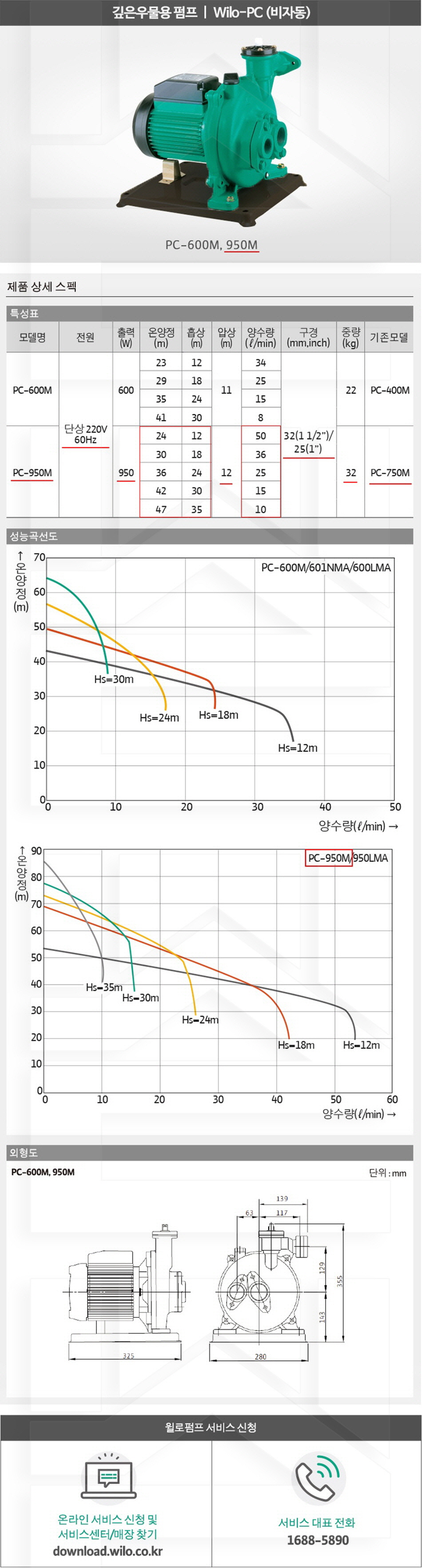 100-44-11-00000950 깊은우물용비자동, 구PC-950M PC-950M/H 판매가 490,000 ~ 원 배송방법 일반배송 브랜드 제조사 윌로펌프 주식회사 상품옵션 품명 옵션코드 규격 중량 판매단위 회원가 수량 PC-600M 100-44-11-00000600 32/25A 22.0kg (22,000g) 0 392,000원 - + PC-950M/H 100-44-11-00000950 32/25A 32.0kg (32,000g) 0 490,000원 - + 총 상품 금액(VAT포함) 원 회원 / 비회원 구매하기 상품담기 제품상세정보 상품문의 (0) 배송 안내 반품/교환 안내 깊은우물용 펌프 비자동 상품 문의하기 배송안내 배송 안내 일반제품 당일 1시 이전 주문시 재고 여부에 따라 당일발송 재고 부족시 2~3일 소요 파손위험제품 (화물택배/차량배송) 파손위험이 큰 제품은 빠렛트로 포장되어 차량으로 이동됩니다. 고객님이 지정한 장소와 가장 가까운 차량접근이 가능한 도로까지만 배송 주문물량 및 제품의 특성에 따라 화물, 화물택배. 합짐차량. 단독차량으로 고객님의 요청에 따라 운송 차량 지정 제품 하차시 파손이 있을 수 있으므로, 꼭 하차전 제품을 확인 고객센터 고객 센터 010-6539-7900 상담시간 오전 09시 ~ 오후 6시 점심 : 12:00 ~ 13:00 / 휴일 : 토, 일요일, 공휴일 반품/교환 안내 제품의 하자 및 오배송은 문의 주시면 즉시 처리해드리겠습니다. 반품/교환 판매자 지정택배사 : CJ대한통운 반품배송비(편도) : 3,000원 교환배송비(왕복) : 6,000원 보내실 곳 : 전라북도 전주시 완산구 콩쥐팥쥐로 1570 * 반품/교환 사유에 따른 요청 가능 기간 구매자 단순 변심 : 상품수령후 7일이내(구매자 반품 배송비 부담) 반품/교환 불가능 사유 교환/반품 요청 기간이 지난 경우 소비자의 책임 있는 사유로 상품 등이 분실/파손/훼손된 경우 소비자의 사용/소비에 의해 상품 등의 가치가 현저히 감소한 경우 제품을 설치 또는 장착하였을 경우 주문제작 상품중 상품제작에 들어간 경우 제품을 하차 또는 시공 후의 공정과정에서 일어난 파손의 경우 교환 반품시 고객 부담 배송비를 지불하지 아니한 경우 * 펌프제품은 미사용, 포장박스 미훼손 시에만 교환/반품이 가능합니다. 고객센터 고객 센터 010-6539-7900 상담시간 오전 09시 ~ 오후 6시 점심 : 12:00 ~ 13:00 / 휴일 : 토, 일요일, 공휴일