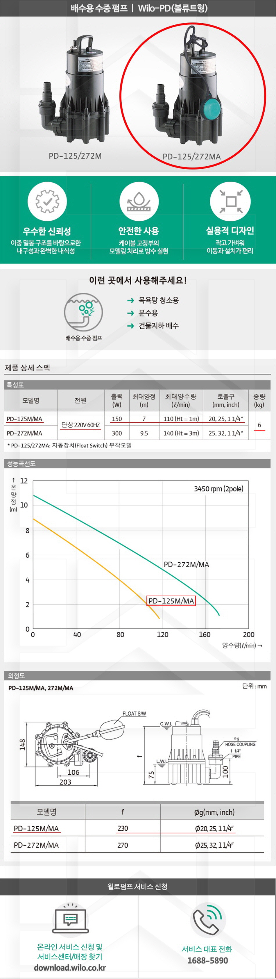 100-52-11-00000125 배수용수중자동, 편수용 PD-125MA 판매가 185,000 ~ 원 배송방법 일반배송 브랜드 제조사 윌로펌프 주식회사 상품옵션 품명 옵션코드 규격 중량 판매단위 회원가 수량 PD-125MA 100-52-11-00000125 20/25A 6.0kg (6,000g) 0 185,000원 - + PD-272MA 100-52-11-00000272 32A호스타입 6.0kg (6,000g) 0 218,000원 - + 총 상품 금액(VAT포함) 원 회원 / 비회원 구매하기 상품담기 제품상세정보 상품문의 (0) 배송 안내 반품/교환 안내 배수용 수중 펌프 볼류트형 상품 문의하기 배송안내 배송 안내 일반제품 당일 1시 이전 주문시 재고 여부에 따라 당일발송 재고 부족시 2~3일 소요 파손위험제품 (화물택배/차량배송) 파손위험이 큰 제품은 빠렛트로 포장되어 차량으로 이동됩니다. 고객님이 지정한 장소와 가장 가까운 차량접근이 가능한 도로까지만 배송 주문물량 및 제품의 특성에 따라 화물, 화물택배. 합짐차량. 단독차량으로 고객님의 요청에 따라 운송 차량 지정 제품 하차시 파손이 있을 수 있으므로, 꼭 하차전 제품을 확인 고객센터 고객 센터 010-6539-7900 상담시간 오전 09시 ~ 오후 6시 점심 : 12:00 ~ 13:00 / 휴일 : 토, 일요일, 공휴일 반품/교환 안내 제품의 하자 및 오배송은 문의 주시면 즉시 처리해드리겠습니다. 반품/교환 판매자 지정택배사 : CJ대한통운 반품배송비(편도) : 3,000원 교환배송비(왕복) : 6,000원 보내실 곳 : 전라북도 전주시 완산구 콩쥐팥쥐로 1570 * 반품/교환 사유에 따른 요청 가능 기간 구매자 단순 변심 : 상품수령후 7일이내(구매자 반품 배송비 부담) 반품/교환 불가능 사유 교환/반품 요청 기간이 지난 경우 소비자의 책임 있는 사유로 상품 등이 분실/파손/훼손된 경우 소비자의 사용/소비에 의해 상품 등의 가치가 현저히 감소한 경우 제품을 설치 또는 장착하였을 경우 주문제작 상품중 상품제작에 들어간 경우 제품을 하차 또는 시공 후의 공정과정에서 일어난 파손의 경우 교환 반품시 고객 부담 배송비를 지불하지 아니한 경우 * 펌프제품은 미사용, 포장박스 미훼손 시에만 교환/반품이 가능합니다. 고객센터 고객 센터 010-6539-7900 상담시간 오전 09시 ~ 오후 6시 점심 : 12:00 ~ 13:00 / 휴일 : 토, 일요일, 공휴일