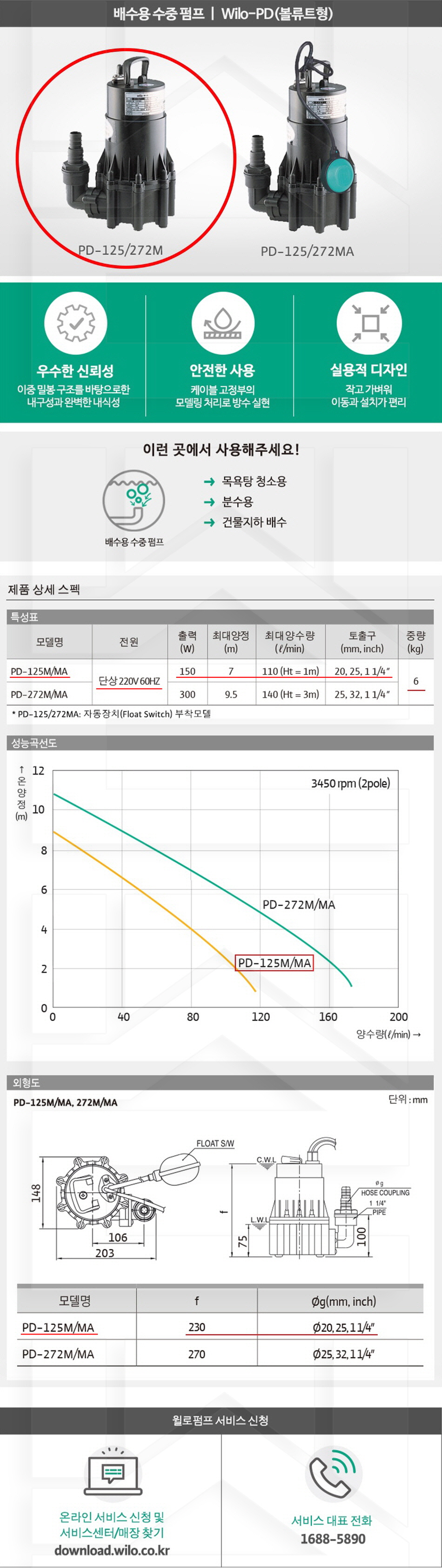 100-52-12-00000125 배수용수중비자동, 편수용 PD-125M 판매가 169,000 ~ 원 배송방법 일반배송 브랜드 제조사 윌로펌프 주식회사 상품옵션 품명 옵션코드 규격 중량 판매단위 회원가 수량 PD-125M 100-52-12-00000125 20/25A 6.0kg (6,000g) 0 169,000원 - + PD-272M 100-52-12-00000272 32A호스타입 6.0kg (6,000g) 0 202,000원 - + 총 상품 금액(VAT포함) 원 회원 / 비회원 구매하기 상품담기 제품상세정보 상품문의 (0) 배송 안내 반품/교환 안내 배수용 수중 펌프 볼류트형 상품 문의하기 배송안내 배송 안내 일반제품 당일 1시 이전 주문시 재고 여부에 따라 당일발송 재고 부족시 2~3일 소요 파손위험제품 (화물택배/차량배송) 파손위험이 큰 제품은 빠렛트로 포장되어 차량으로 이동됩니다. 고객님이 지정한 장소와 가장 가까운 차량접근이 가능한 도로까지만 배송 주문물량 및 제품의 특성에 따라 화물, 화물택배. 합짐차량. 단독차량으로 고객님의 요청에 따라 운송 차량 지정 제품 하차시 파손이 있을 수 있으므로, 꼭 하차전 제품을 확인 고객센터 고객 센터 010-6539-7900 상담시간 오전 09시 ~ 오후 6시 점심 : 12:00 ~ 13:00 / 휴일 : 토, 일요일, 공휴일 반품/교환 안내 제품의 하자 및 오배송은 문의 주시면 즉시 처리해드리겠습니다. 반품/교환 판매자 지정택배사 : CJ대한통운 반품배송비(편도) : 3,000원 교환배송비(왕복) : 6,000원 보내실 곳 : 전라북도 전주시 완산구 콩쥐팥쥐로 1570 * 반품/교환 사유에 따른 요청 가능 기간 구매자 단순 변심 : 상품수령후 7일이내(구매자 반품 배송비 부담) 반품/교환 불가능 사유 교환/반품 요청 기간이 지난 경우 소비자의 책임 있는 사유로 상품 등이 분실/파손/훼손된 경우 소비자의 사용/소비에 의해 상품 등의 가치가 현저히 감소한 경우 제품을 설치 또는 장착하였을 경우 주문제작 상품중 상품제작에 들어간 경우 제품을 하차 또는 시공 후의 공정과정에서 일어난 파손의 경우 교환 반품시 고객 부담 배송비를 지불하지 아니한 경우 * 펌프제품은 미사용, 포장박스 미훼손 시에만 교환/반품이 가능합니다. 고객센터 고객 센터 010-6539-7900 상담시간 오전 09시 ~ 오후 6시 점심 : 12:00 ~ 13:00 / 휴일 : 토, 일요일, 공휴일