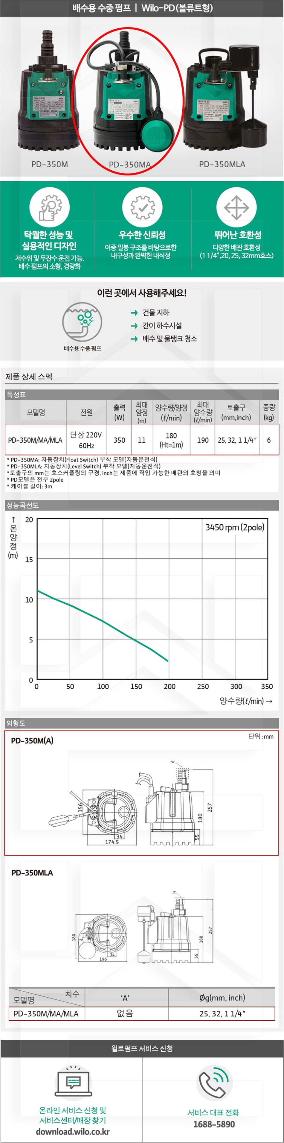 100-53-11-00000350 배수용수중자동, 전수로용 PD-350MA 판매가 213,000 ~ 원 배송방법 일반배송 브랜드 제조사 윌로펌프 주식회사 상품옵션 품명 옵션코드 규격 중량 판매단위 회원가 수량 PD-200MA 100-53-11-00000200 25A호스타입 5.5kg (5,500g) 0 186,000원 - + PD-350MA 100-53-11-00000350 32A 5.5kg (5,500g) 0 213,000원 - + PD-550MA 100-53-11-00000550 50A 8.0kg (8,000g) 0 308,000원 - + PD-760MA 100-53-11-00000760 50A 8.5kg (8,500g) 0 343,000원 - + 총 상품 금액(VAT포함) 원 회원 / 비회원 구매하기 상품담기 제품상세정보 상품문의 (0) 배송 안내 반품/교환 안내 배수용 수중 펌프 볼류트형 상품 문의하기 배송안내 배송 안내 일반제품 당일 1시 이전 주문시 재고 여부에 따라 당일발송 재고 부족시 2~3일 소요 파손위험제품 (화물택배/차량배송) 파손위험이 큰 제품은 빠렛트로 포장되어 차량으로 이동됩니다. 고객님이 지정한 장소와 가장 가까운 차량접근이 가능한 도로까지만 배송 주문물량 및 제품의 특성에 따라 화물, 화물택배. 합짐차량. 단독차량으로 고객님의 요청에 따라 운송 차량 지정 제품 하차시 파손이 있을 수 있으므로, 꼭 하차전 제품을 확인 고객센터 고객 센터 010-6539-7900 상담시간 오전 09시 ~ 오후 6시 점심 : 12:00 ~ 13:00 / 휴일 : 토, 일요일, 공휴일 반품/교환 안내 제품의 하자 및 오배송은 문의 주시면 즉시 처리해드리겠습니다. 반품/교환 판매자 지정택배사 : CJ대한통운 반품배송비(편도) : 3,000원 교환배송비(왕복) : 6,000원 보내실 곳 : 전라북도 전주시 완산구 콩쥐팥쥐로 1570 * 반품/교환 사유에 따른 요청 가능 기간 구매자 단순 변심 : 상품수령후 7일이내(구매자 반품 배송비 부담) 반품/교환 불가능 사유 교환/반품 요청 기간이 지난 경우 소비자의 책임 있는 사유로 상품 등이 분실/파손/훼손된 경우 소비자의 사용/소비에 의해 상품 등의 가치가 현저히 감소한 경우 제품을 설치 또는 장착하였을 경우 주문제작 상품중 상품제작에 들어간 경우 제품을 하차 또는 시공 후의 공정과정에서 일어난 파손의 경우 교환 반품시 고객 부담 배송비를 지불하지 아니한 경우 * 펌프제품은 미사용, 포장박스 미훼손 시에만 교환/반품이 가능합니다. 고객센터 고객 센터 010-6539-7900 상담시간 오전 09시 ~ 오후 6시 점심 : 12:00 ~ 13:00 / 휴일 : 토, 일요일, 공휴일