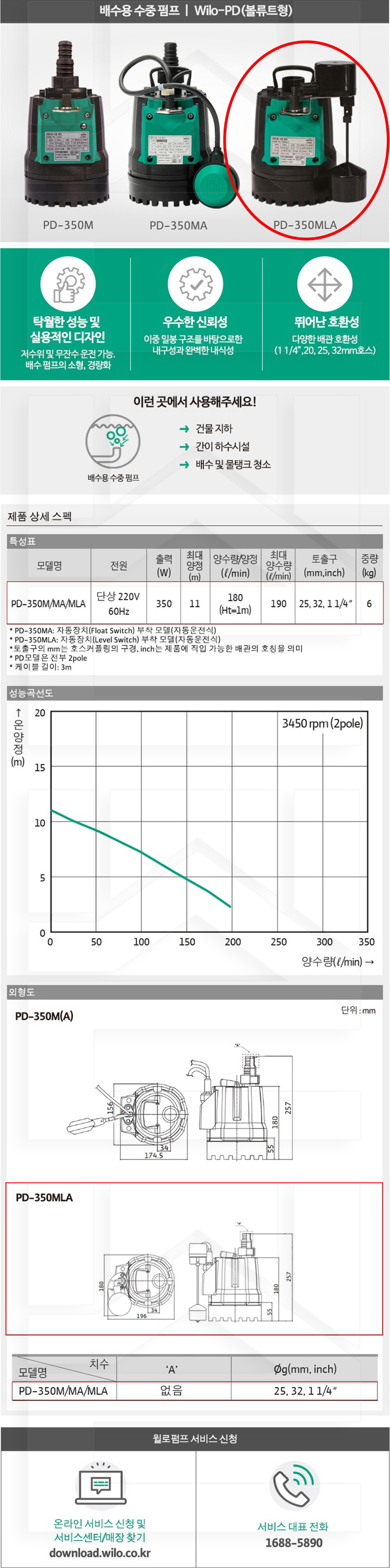 100-53-12-00000350 배수용수중자동레벨스위치형, 전수로용 PD-350MLA 판매가 244,000 ~ 원 배송방법 일반배송 브랜드 제조사 윌로펌프 주식회사 상품옵션 품명 옵션코드 규격 중량 판매단위 회원가 수량 PD-200MLA 100-53-12-00000200 25A호스타입 5.5kg (5,500g) 0 215,000원 - + PD-350MLA 100-53-12-00000350 32A 5.5kg (5,500g) 0 244,000원 - + PD-550MLA 100-53-12-00000550 50A 8.0kg (8,000g) 0 337,000원 - + PD-760MLA 100-53-12-00000760 50A 8.5kg (8,500g) 0 371,000원 - + 총 상품 금액(VAT포함) 원 회원 / 비회원 구매하기 상품담기 제품상세정보 상품문의 (0) 배송 안내 반품/교환 안내 배수용 수중 펌프 볼류트형 상품 문의하기 배송안내 배송 안내 일반제품 당일 1시 이전 주문시 재고 여부에 따라 당일발송 재고 부족시 2~3일 소요 파손위험제품 (화물택배/차량배송) 파손위험이 큰 제품은 빠렛트로 포장되어 차량으로 이동됩니다. 고객님이 지정한 장소와 가장 가까운 차량접근이 가능한 도로까지만 배송 주문물량 및 제품의 특성에 따라 화물, 화물택배. 합짐차량. 단독차량으로 고객님의 요청에 따라 운송 차량 지정 제품 하차시 파손이 있을 수 있으므로, 꼭 하차전 제품을 확인 고객센터 고객 센터 010-6539-7900 상담시간 오전 09시 ~ 오후 6시 점심 : 12:00 ~ 13:00 / 휴일 : 토, 일요일, 공휴일 반품/교환 안내 제품의 하자 및 오배송은 문의 주시면 즉시 처리해드리겠습니다. 반품/교환 판매자 지정택배사 : CJ대한통운 반품배송비(편도) : 3,000원 교환배송비(왕복) : 6,000원 보내실 곳 : 전라북도 전주시 완산구 콩쥐팥쥐로 1570 * 반품/교환 사유에 따른 요청 가능 기간 구매자 단순 변심 : 상품수령후 7일이내(구매자 반품 배송비 부담) 반품/교환 불가능 사유 교환/반품 요청 기간이 지난 경우 소비자의 책임 있는 사유로 상품 등이 분실/파손/훼손된 경우 소비자의 사용/소비에 의해 상품 등의 가치가 현저히 감소한 경우 제품을 설치 또는 장착하였을 경우 주문제작 상품중 상품제작에 들어간 경우 제품을 하차 또는 시공 후의 공정과정에서 일어난 파손의 경우 교환 반품시 고객 부담 배송비를 지불하지 아니한 경우 * 펌프제품은 미사용, 포장박스 미훼손 시에만 교환/반품이 가능합니다. 고객센터 고객 센터 010-6539-7900 상담시간 오전 09시 ~ 오후 6시 점심 : 12:00 ~ 13:00 / 휴일 : 토, 일요일, 공휴일
