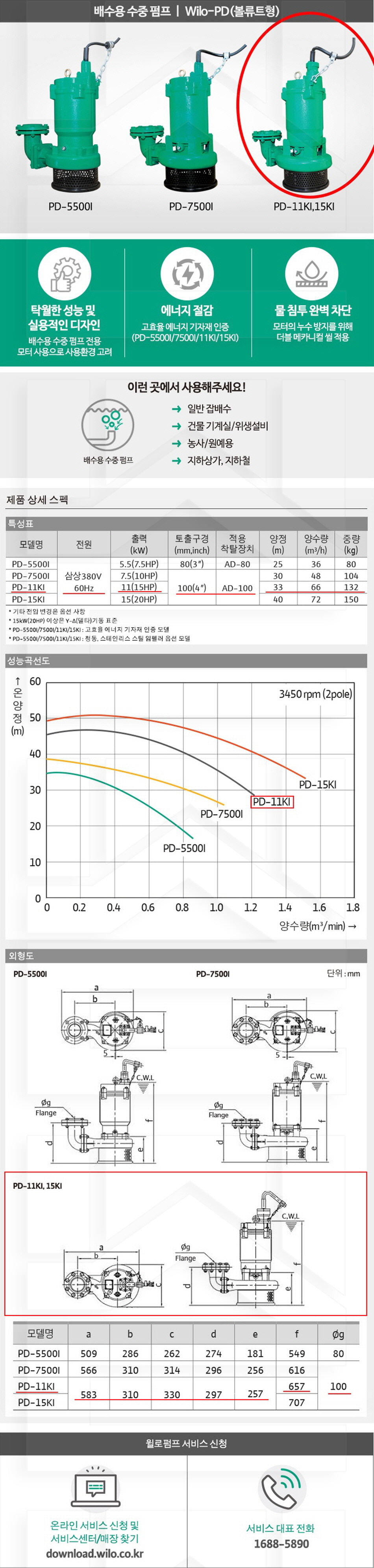 100-54-15-00110000 배수용수중비자동 삼상380, 잡배수용 PD-11KI 판매가 2,594,000 ~ 원 배송방법 일반배송 브랜드 제조사 윌로펌프 주식회사 상품옵션 품명 옵션코드 규격 중량 판매단위 회원가 수량 PD-1505I 100-54-15-00001505 50A 30.0kg (30,000g) 0 656,000원 - + PD-2200I 100-54-15-00002200 80A 50.0kg (50,000g) 0 766,000원 - + PD-3701I 100-54-15-00003701 80A 68.0kg (68,000g) 0 1,075,000원 - + PD-5500I 100-54-15-00005500 80A 80.0kg (80,000g) 0 1,423,000원 - + PD-7500I 100-54-15-00007500 100A 104.0kg (104,000g) 0 1,829,000원 - + PD-11KI 100-54-15-00110000 100A 132.0kg (132,000g) 0 2,594,000원 - + PD-15KI 100-54-15-00150000 100A 150.0kg (150,000g) 0 2,963,000원 - + 총 상품 금액(VAT포함) 원 회원 / 비회원 구매하기 상품담기 제품상세정보 상품문의 (0) 배송 안내 반품/교환 안내 배수용 수중 펌프 볼류트형 상품 문의하기 배송안내 배송 안내 일반제품 당일 1시 이전 주문시 재고 여부에 따라 당일발송 재고 부족시 2~3일 소요 파손위험제품 (화물택배/차량배송) 파손위험이 큰 제품은 빠렛트로 포장되어 차량으로 이동됩니다. 고객님이 지정한 장소와 가장 가까운 차량접근이 가능한 도로까지만 배송 주문물량 및 제품의 특성에 따라 화물, 화물택배. 합짐차량. 단독차량으로 고객님의 요청에 따라 운송 차량 지정 제품 하차시 파손이 있을 수 있으므로, 꼭 하차전 제품을 확인 고객센터 고객 센터 010-6539-7900 상담시간 오전 09시 ~ 오후 6시 점심 : 12:00 ~ 13:00 / 휴일 : 토, 일요일, 공휴일 반품/교환 안내 제품의 하자 및 오배송은 문의 주시면 즉시 처리해드리겠습니다. 반품/교환 판매자 지정택배사 : CJ대한통운 반품배송비(편도) : 3,000원 교환배송비(왕복) : 6,000원 보내실 곳 : 전라북도 전주시 완산구 콩쥐팥쥐로 1570 * 반품/교환 사유에 따른 요청 가능 기간 구매자 단순 변심 : 상품수령후 7일이내(구매자 반품 배송비 부담) 반품/교환 불가능 사유 교환/반품 요청 기간이 지난 경우 소비자의 책임 있는 사유로 상품 등이 분실/파손/훼손된 경우 소비자의 사용/소비에 의해 상품 등의 가치가 현저히 감소한 경우 제품을 설치 또는 장착하였을 경우 주문제작 상품중 상품제작에 들어간 경우 제품을 하차 또는 시공 후의 공정과정에서 일어난 파손의 경우 교환 반품시 고객 부담 배송비를 지불하지 아니한 경우 * 펌프제품은 미사용, 포장박스 미훼손 시에만 교환/반품이 가능합니다. 고객센터 고객 센터 010-6539-7900 상담시간 오전 09시 ~ 오후 6시 점심 : 12:00 ~ 13:00 / 휴일 : 토, 일요일, 공휴일