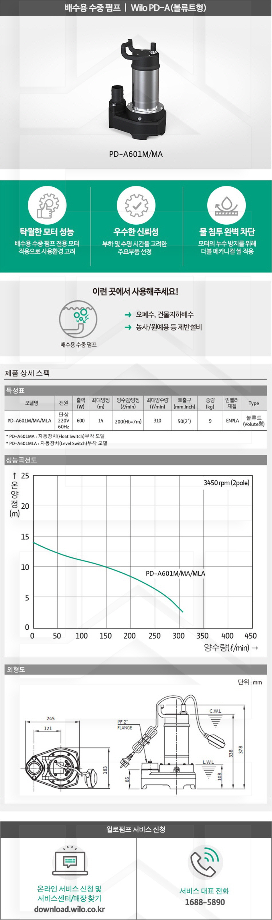 100-56-11-00000601 배수용수중자동, 알미늄 PD-A601MA 판매가 326,000 ~ 원 배송방법 일반배송 브랜드 제조사 윌로펌프 주식회사 상품옵션 품명 옵션코드 규격 중량 판매단위 회원가 수량 PD-A601MA 100-56-11-00000601 50A 9.0kg (9,000g) 0 326,000원 - + PD-A951MA 100-56-11-00000951 50A 9.0kg (9,000g) 0 404,000원 - + 총 상품 금액(VAT포함) 원 회원 / 비회원 구매하기 상품담기 제품상세정보 상품문의 (0) 배송 안내 반품/교환 안내 배수용 수중 펌프 볼류트형 상품 문의하기 배송안내 배송 안내 일반제품 당일 1시 이전 주문시 재고 여부에 따라 당일발송 재고 부족시 2~3일 소요 파손위험제품 (화물택배/차량배송) 파손위험이 큰 제품은 빠렛트로 포장되어 차량으로 이동됩니다. 고객님이 지정한 장소와 가장 가까운 차량접근이 가능한 도로까지만 배송 주문물량 및 제품의 특성에 따라 화물, 화물택배. 합짐차량. 단독차량으로 고객님의 요청에 따라 운송 차량 지정 제품 하차시 파손이 있을 수 있으므로, 꼭 하차전 제품을 확인 고객센터 고객 센터 010-6539-7900 상담시간 오전 09시 ~ 오후 6시 점심 : 12:00 ~ 13:00 / 휴일 : 토, 일요일, 공휴일 반품/교환 안내 제품의 하자 및 오배송은 문의 주시면 즉시 처리해드리겠습니다. 반품/교환 판매자 지정택배사 : CJ대한통운 반품배송비(편도) : 3,000원 교환배송비(왕복) : 6,000원 보내실 곳 : 전라북도 전주시 완산구 콩쥐팥쥐로 1570 * 반품/교환 사유에 따른 요청 가능 기간 구매자 단순 변심 : 상품수령후 7일이내(구매자 반품 배송비 부담) 반품/교환 불가능 사유 교환/반품 요청 기간이 지난 경우 소비자의 책임 있는 사유로 상품 등이 분실/파손/훼손된 경우 소비자의 사용/소비에 의해 상품 등의 가치가 현저히 감소한 경우 제품을 설치 또는 장착하였을 경우 주문제작 상품중 상품제작에 들어간 경우 제품을 하차 또는 시공 후의 공정과정에서 일어난 파손의 경우 교환 반품시 고객 부담 배송비를 지불하지 아니한 경우 * 펌프제품은 미사용, 포장박스 미훼손 시에만 교환/반품이 가능합니다. 고객센터 고객 센터 010-6539-7900 상담시간 오전 09시 ~ 오후 6시 점심 : 12:00 ~ 13:00 / 휴일 : 토, 일요일, 공휴일
