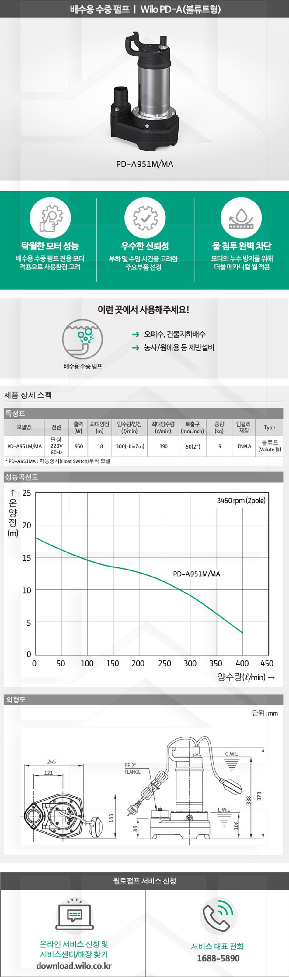 100-56-11-00000951 배수용수중자동, 알미늄 PD-A951MA 판매가 404,000 ~ 원 배송방법 일반배송 브랜드 제조사 윌로펌프 주식회사 상품옵션 품명 옵션코드 규격 중량 판매단위 회원가 수량 PD-A601MA 100-56-11-00000601 50A 9.0kg (9,000g) 0 326,000원 - + PD-A951MA 100-56-11-00000951 50A 9.0kg (9,000g) 0 404,000원 - + 총 상품 금액(VAT포함) 원 회원 / 비회원 구매하기 상품담기 제품상세정보 상품문의 (0) 배송 안내 반품/교환 안내 배수용 수중 펌프 볼류트형 상품 문의하기 배송안내 배송 안내 일반제품 당일 1시 이전 주문시 재고 여부에 따라 당일발송 재고 부족시 2~3일 소요 파손위험제품 (화물택배/차량배송) 파손위험이 큰 제품은 빠렛트로 포장되어 차량으로 이동됩니다. 고객님이 지정한 장소와 가장 가까운 차량접근이 가능한 도로까지만 배송 주문물량 및 제품의 특성에 따라 화물, 화물택배. 합짐차량. 단독차량으로 고객님의 요청에 따라 운송 차량 지정 제품 하차시 파손이 있을 수 있으므로, 꼭 하차전 제품을 확인 고객센터 고객 센터 010-6539-7900 상담시간 오전 09시 ~ 오후 6시 점심 : 12:00 ~ 13:00 / 휴일 : 토, 일요일, 공휴일 반품/교환 안내 제품의 하자 및 오배송은 문의 주시면 즉시 처리해드리겠습니다. 반품/교환 판매자 지정택배사 : CJ대한통운 반품배송비(편도) : 3,000원 교환배송비(왕복) : 6,000원 보내실 곳 : 전라북도 전주시 완산구 콩쥐팥쥐로 1570 * 반품/교환 사유에 따른 요청 가능 기간 구매자 단순 변심 : 상품수령후 7일이내(구매자 반품 배송비 부담) 반품/교환 불가능 사유 교환/반품 요청 기간이 지난 경우 소비자의 책임 있는 사유로 상품 등이 분실/파손/훼손된 경우 소비자의 사용/소비에 의해 상품 등의 가치가 현저히 감소한 경우 제품을 설치 또는 장착하였을 경우 주문제작 상품중 상품제작에 들어간 경우 제품을 하차 또는 시공 후의 공정과정에서 일어난 파손의 경우 교환 반품시 고객 부담 배송비를 지불하지 아니한 경우 * 펌프제품은 미사용, 포장박스 미훼손 시에만 교환/반품이 가능합니다. 고객센터 고객 센터 010-6539-7900 상담시간 오전 09시 ~ 오후 6시 점심 : 12:00 ~ 13:00 / 휴일 : 토, 일요일, 공휴일