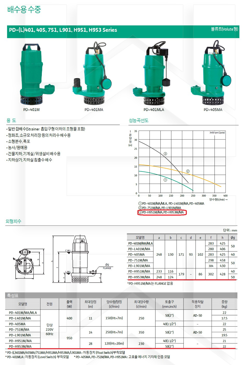 100-57-11-00000953 배수용수중자동, 고양정 PD-H953MA 판매가 428,000 원 배송방법 일반배송 브랜드 제조사 윌로펌프 주식회사 상품옵션 품명 옵션코드 규격 중량 판매단위 회원가 수량 PD-H953MA 100-57-11-00000953 50A 22.0kg (22,000g) 0 428,000원 - + 총 상품 금액(VAT포함) 원 회원 / 비회원 구매하기 상품담기 제품상세정보 상품문의 (0) 배송 안내 반품/교환 안내 배수용 수중 펌프 볼류트형 상품 문의하기 배송안내 배송 안내 일반제품 당일 1시 이전 주문시 재고 여부에 따라 당일발송 재고 부족시 2~3일 소요 파손위험제품 (화물택배/차량배송) 파손위험이 큰 제품은 빠렛트로 포장되어 차량으로 이동됩니다. 고객님이 지정한 장소와 가장 가까운 차량접근이 가능한 도로까지만 배송 주문물량 및 제품의 특성에 따라 화물, 화물택배. 합짐차량. 단독차량으로 고객님의 요청에 따라 운송 차량 지정 제품 하차시 파손이 있을 수 있으므로, 꼭 하차전 제품을 확인 고객센터 고객 센터 010-6539-7900 상담시간 오전 09시 ~ 오후 6시 점심 : 12:00 ~ 13:00 / 휴일 : 토, 일요일, 공휴일 반품/교환 안내 제품의 하자 및 오배송은 문의 주시면 즉시 처리해드리겠습니다. 반품/교환 판매자 지정택배사 : CJ대한통운 반품배송비(편도) : 3,000원 교환배송비(왕복) : 6,000원 보내실 곳 : 전라북도 전주시 완산구 콩쥐팥쥐로 1570 * 반품/교환 사유에 따른 요청 가능 기간 구매자 단순 변심 : 상품수령후 7일이내(구매자 반품 배송비 부담) 반품/교환 불가능 사유 교환/반품 요청 기간이 지난 경우 소비자의 책임 있는 사유로 상품 등이 분실/파손/훼손된 경우 소비자의 사용/소비에 의해 상품 등의 가치가 현저히 감소한 경우 제품을 설치 또는 장착하였을 경우 주문제작 상품중 상품제작에 들어간 경우 제품을 하차 또는 시공 후의 공정과정에서 일어난 파손의 경우 교환 반품시 고객 부담 배송비를 지불하지 아니한 경우 * 펌프제품은 미사용, 포장박스 미훼손 시에만 교환/반품이 가능합니다. 고객센터 고객 센터 010-6539-7900 상담시간 오전 09시 ~ 오후 6시 점심 : 12:00 ~ 13:00 / 휴일 : 토, 일요일, 공휴일