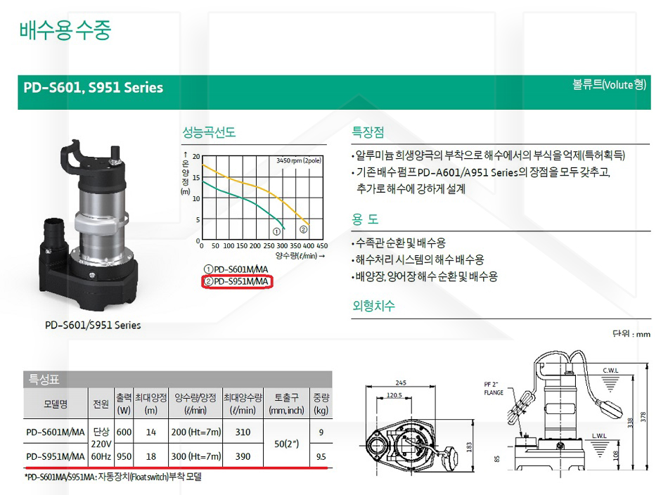 100-58-11-00000951 배수용수중자동, 해수용 PD-S951MA 판매가 571,000 ~ 원 배송방법 일반배송 브랜드 제조사 윌로펌프 주식회사 상품옵션 품명 옵션코드 규격 중량 판매단위 회원가 수량 PD-S601MA 100-58-11-00000601 50A 9.0kg (9,000g) 0 471,000원 - + PD-S951MA 100-58-11-00000951 50A 9.5kg (9,500g) 0 571,000원 - + 총 상품 금액(VAT포함) 원 회원 / 비회원 구매하기 상품담기 제품상세정보 상품문의 (0) 배송 안내 반품/교환 안내 배수용 수중 펌프 볼류트형 상품 문의하기 배송안내 배송 안내 일반제품 당일 1시 이전 주문시 재고 여부에 따라 당일발송 재고 부족시 2~3일 소요 파손위험제품 (화물택배/차량배송) 파손위험이 큰 제품은 빠렛트로 포장되어 차량으로 이동됩니다. 고객님이 지정한 장소와 가장 가까운 차량접근이 가능한 도로까지만 배송 주문물량 및 제품의 특성에 따라 화물, 화물택배. 합짐차량. 단독차량으로 고객님의 요청에 따라 운송 차량 지정 제품 하차시 파손이 있을 수 있으므로, 꼭 하차전 제품을 확인 고객센터 고객 센터 010-6539-7900 상담시간 오전 09시 ~ 오후 6시 점심 : 12:00 ~ 13:00 / 휴일 : 토, 일요일, 공휴일 반품/교환 안내 제품의 하자 및 오배송은 문의 주시면 즉시 처리해드리겠습니다. 반품/교환 판매자 지정택배사 : CJ대한통운 반품배송비(편도) : 3,000원 교환배송비(왕복) : 6,000원 보내실 곳 : 전라북도 전주시 완산구 콩쥐팥쥐로 1570 * 반품/교환 사유에 따른 요청 가능 기간 구매자 단순 변심 : 상품수령후 7일이내(구매자 반품 배송비 부담) 반품/교환 불가능 사유 교환/반품 요청 기간이 지난 경우 소비자의 책임 있는 사유로 상품 등이 분실/파손/훼손된 경우 소비자의 사용/소비에 의해 상품 등의 가치가 현저히 감소한 경우 제품을 설치 또는 장착하였을 경우 주문제작 상품중 상품제작에 들어간 경우 제품을 하차 또는 시공 후의 공정과정에서 일어난 파손의 경우 교환 반품시 고객 부담 배송비를 지불하지 아니한 경우 * 펌프제품은 미사용, 포장박스 미훼손 시에만 교환/반품이 가능합니다. 고객센터 고객 센터 010-6539-7900 상담시간 오전 09시 ~ 오후 6시 점심 : 12:00 ~ 13:00 / 휴일 : 토, 일요일, 공휴일