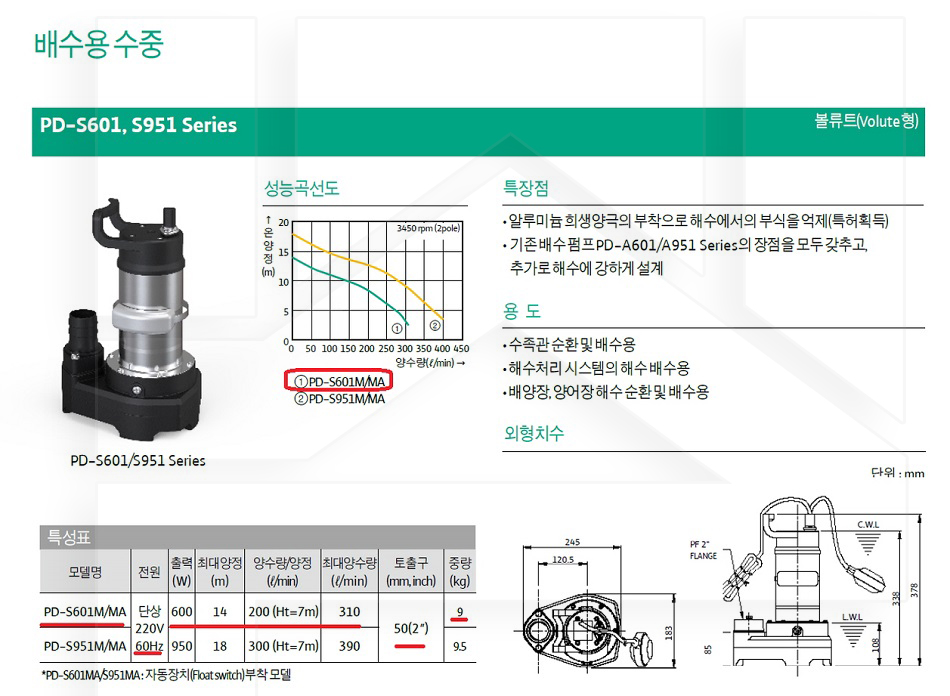 100-58-12-00000601 배수용수중비자동, 해수용 PD-S601M 판매가 447,000 ~ 원 배송방법 일반배송 브랜드 제조사 윌로펌프 주식회사 상품옵션 품명 옵션코드 규격 중량 판매단위 회원가 수량 PD-S601M 100-58-12-00000601 50A 9.0kg (9,000g) 0 447,000원 - + PD-S951M 100-58-12-00000951 50A 9.5kg (9,500g) 0 547,000원 - + 총 상품 금액(VAT포함) 원 회원 / 비회원 구매하기 상품담기 제품상세정보 상품문의 (0) 배송 안내 반품/교환 안내 배수용 수중 펌프 볼류트형 상품 문의하기 배송안내 배송 안내 일반제품 당일 1시 이전 주문시 재고 여부에 따라 당일발송 재고 부족시 2~3일 소요 파손위험제품 (화물택배/차량배송) 파손위험이 큰 제품은 빠렛트로 포장되어 차량으로 이동됩니다. 고객님이 지정한 장소와 가장 가까운 차량접근이 가능한 도로까지만 배송 주문물량 및 제품의 특성에 따라 화물, 화물택배. 합짐차량. 단독차량으로 고객님의 요청에 따라 운송 차량 지정 제품 하차시 파손이 있을 수 있으므로, 꼭 하차전 제품을 확인 고객센터 고객 센터 010-6539-7900 상담시간 오전 09시 ~ 오후 6시 점심 : 12:00 ~ 13:00 / 휴일 : 토, 일요일, 공휴일 반품/교환 안내 제품의 하자 및 오배송은 문의 주시면 즉시 처리해드리겠습니다. 반품/교환 판매자 지정택배사 : CJ대한통운 반품배송비(편도) : 3,000원 교환배송비(왕복) : 6,000원 보내실 곳 : 전라북도 전주시 완산구 콩쥐팥쥐로 1570 * 반품/교환 사유에 따른 요청 가능 기간 구매자 단순 변심 : 상품수령후 7일이내(구매자 반품 배송비 부담) 반품/교환 불가능 사유 교환/반품 요청 기간이 지난 경우 소비자의 책임 있는 사유로 상품 등이 분실/파손/훼손된 경우 소비자의 사용/소비에 의해 상품 등의 가치가 현저히 감소한 경우 제품을 설치 또는 장착하였을 경우 주문제작 상품중 상품제작에 들어간 경우 제품을 하차 또는 시공 후의 공정과정에서 일어난 파손의 경우 교환 반품시 고객 부담 배송비를 지불하지 아니한 경우 * 펌프제품은 미사용, 포장박스 미훼손 시에만 교환/반품이 가능합니다. 고객센터 고객 센터 010-6539-7900 상담시간 오전 09시 ~ 오후 6시 점심 : 12:00 ~ 13:00 / 휴일 : 토, 일요일, 공휴일