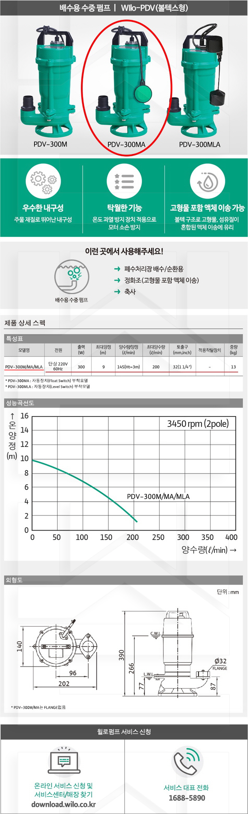 100-62-11-00000300 오수자동, 구PDV-270MA PDV-300MA 판매가 219,000 ~ 원 배송방법 일반배송 브랜드 제조사 윌로펌프 주식회사 상품옵션 품명 옵션코드 규격 중량 판매단위 회원가 수량 PDV-300MA 100-62-11-00000300 32A 13.0kg (13,000g) 0 219,000원 - + PDV-400MA 100-62-11-00000400 50A 20.0kg (20,000g) 0 344,000원 - + PDV-750MA, PDV-950MA 100-62-11-00000750 50A 24.0kg (24,000g) 0 417,000원 - + PDV-754MA 100-62-11-00000754 50A 24.0kg (24,000g) 0 494,000원 - + 총 상품 금액(VAT포함) 원 회원 / 비회원 구매하기 상품담기 제품상세정보 상품문의 (0) 배송 안내 반품/교환 안내 배수용 수중 펌프 볼텍스형 상품 문의하기 배송안내 배송 안내 일반제품 당일 1시 이전 주문시 재고 여부에 따라 당일발송 재고 부족시 2~3일 소요 파손위험제품 (화물택배/차량배송) 파손위험이 큰 제품은 빠렛트로 포장되어 차량으로 이동됩니다. 고객님이 지정한 장소와 가장 가까운 차량접근이 가능한 도로까지만 배송 주문물량 및 제품의 특성에 따라 화물, 화물택배. 합짐차량. 단독차량으로 고객님의 요청에 따라 운송 차량 지정 제품 하차시 파손이 있을 수 있으므로, 꼭 하차전 제품을 확인 고객센터 고객 센터 010-6539-7900 상담시간 오전 09시 ~ 오후 6시 점심 : 12:00 ~ 13:00 / 휴일 : 토, 일요일, 공휴일 반품/교환 안내 제품의 하자 및 오배송은 문의 주시면 즉시 처리해드리겠습니다. 반품/교환 판매자 지정택배사 : CJ대한통운 반품배송비(편도) : 3,000원 교환배송비(왕복) : 6,000원 보내실 곳 : 전라북도 전주시 완산구 콩쥐팥쥐로 1570 * 반품/교환 사유에 따른 요청 가능 기간 구매자 단순 변심 : 상품수령후 7일이내(구매자 반품 배송비 부담) 반품/교환 불가능 사유 교환/반품 요청 기간이 지난 경우 소비자의 책임 있는 사유로 상품 등이 분실/파손/훼손된 경우 소비자의 사용/소비에 의해 상품 등의 가치가 현저히 감소한 경우 제품을 설치 또는 장착하였을 경우 주문제작 상품중 상품제작에 들어간 경우 제품을 하차 또는 시공 후의 공정과정에서 일어난 파손의 경우 교환 반품시 고객 부담 배송비를 지불하지 아니한 경우 * 펌프제품은 미사용, 포장박스 미훼손 시에만 교환/반품이 가능합니다. 고객센터 고객 센터 010-6539-7900 상담시간 오전 09시 ~ 오후 6시 점심 : 12:00 ~ 13:00 / 휴일 : 토, 일요일, 공휴일