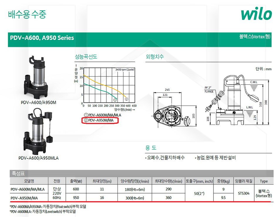 100-64-11-00000950 오수자동, 구PDV-A750MA PDV-A950MA 판매가 397,000 ~ 원 배송방법 일반배송 브랜드 제조사 윌로펌프 주식회사 상품옵션 품명 옵션코드 규격 중량 판매단위 회원가 수량 PDV-A600MA 100-64-11-00000600 50A 9.0kg (9,000g) 0 319,000원 - + PDV-A950MA 100-64-11-00000950 50A 9.5kg (9,500g) 0 397,000원 - + 총 상품 금액(VAT포함) 원 회원 / 비회원 구매하기 상품담기 제품상세정보 상품문의 (0) 배송 안내 반품/교환 안내 배수용 수중 펌프 볼텍스형 상품 문의하기 배송안내 배송 안내 일반제품 당일 1시 이전 주문시 재고 여부에 따라 당일발송 재고 부족시 2~3일 소요 파손위험제품 (화물택배/차량배송) 파손위험이 큰 제품은 빠렛트로 포장되어 차량으로 이동됩니다. 고객님이 지정한 장소와 가장 가까운 차량접근이 가능한 도로까지만 배송 주문물량 및 제품의 특성에 따라 화물, 화물택배. 합짐차량. 단독차량으로 고객님의 요청에 따라 운송 차량 지정 제품 하차시 파손이 있을 수 있으므로, 꼭 하차전 제품을 확인 고객센터 고객 센터 010-6539-7900 상담시간 오전 09시 ~ 오후 6시 점심 : 12:00 ~ 13:00 / 휴일 : 토, 일요일, 공휴일 반품/교환 안내 제품의 하자 및 오배송은 문의 주시면 즉시 처리해드리겠습니다. 반품/교환 판매자 지정택배사 : CJ대한통운 반품배송비(편도) : 3,000원 교환배송비(왕복) : 6,000원 보내실 곳 : 전라북도 전주시 완산구 콩쥐팥쥐로 1570 * 반품/교환 사유에 따른 요청 가능 기간 구매자 단순 변심 : 상품수령후 7일이내(구매자 반품 배송비 부담) 반품/교환 불가능 사유 교환/반품 요청 기간이 지난 경우 소비자의 책임 있는 사유로 상품 등이 분실/파손/훼손된 경우 소비자의 사용/소비에 의해 상품 등의 가치가 현저히 감소한 경우 제품을 설치 또는 장착하였을 경우 주문제작 상품중 상품제작에 들어간 경우 제품을 하차 또는 시공 후의 공정과정에서 일어난 파손의 경우 교환 반품시 고객 부담 배송비를 지불하지 아니한 경우 * 펌프제품은 미사용, 포장박스 미훼손 시에만 교환/반품이 가능합니다. 고객센터 고객 센터 010-6539-7900 상담시간 오전 09시 ~ 오후 6시 점심 : 12:00 ~ 13:00 / 휴일 : 토, 일요일, 공휴일