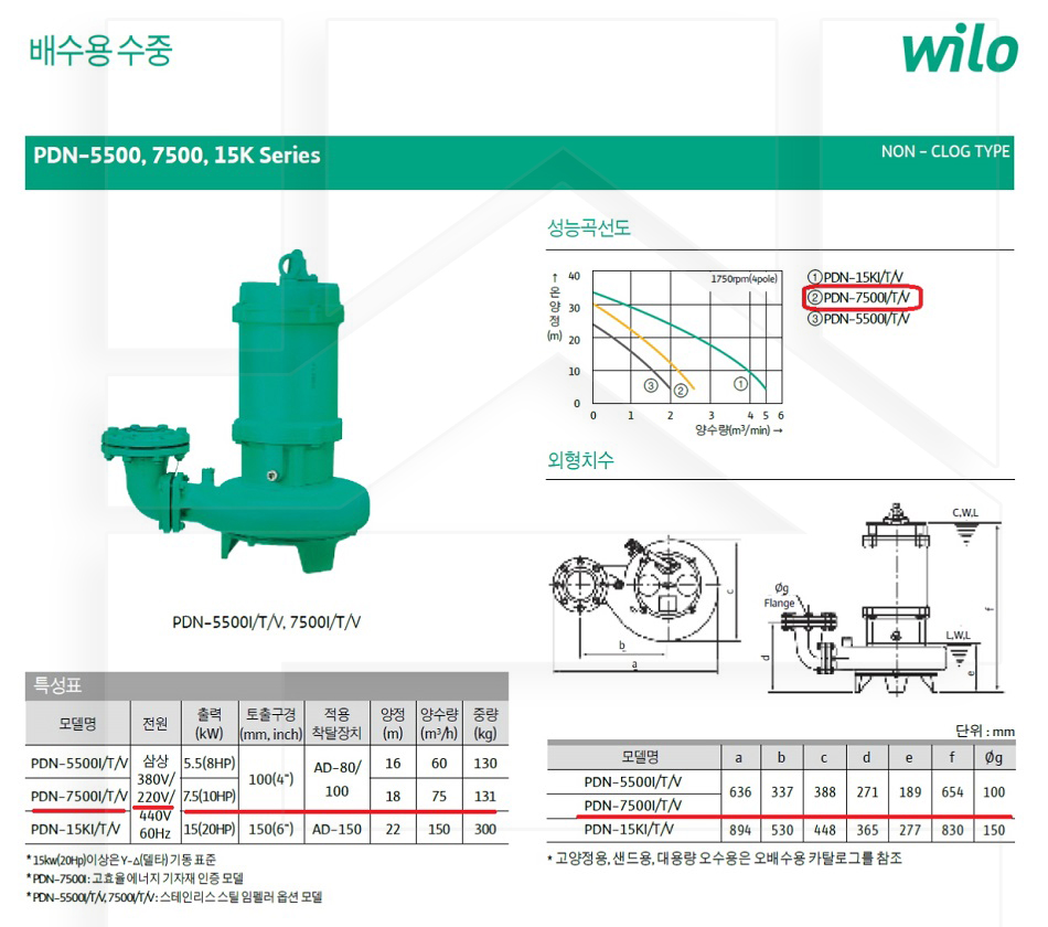 100-65-13-00007500 오수비자동 삼상220 PDN-7500T 판매가 2,054,000 ~ 원 배송방법 일반배송 브랜드 제조사 윌로펌프 주식회사 상품옵션 품명 옵션코드 규격 중량 판매단위 회원가 수량 PDN-2200T 100-65-13-00002200 80A 50.0kg (50,000g) 0 698,000원 - + PDN-2500T 100-65-13-00002500 80A 55.0kg (55,000g) 0 765,000원 - + PDN-5500T 100-65-13-00005500 100A 130.0kg (130,000g) 0 1,902,000원 - + PDN-7500T 100-65-13-00007500 100A 131.0kg (131,000g) 0 2,054,000원 - + 총 상품 금액(VAT포함) 원 회원 / 비회원 구매하기 상품담기 제품상세정보 상품문의 (0) 배송 안내 반품/교환 안내 배수용 수중 펌프 논클로그형 상품 문의하기 배송안내 배송 안내 일반제품 당일 1시 이전 주문시 재고 여부에 따라 당일발송 재고 부족시 2~3일 소요 파손위험제품 (화물택배/차량배송) 파손위험이 큰 제품은 빠렛트로 포장되어 차량으로 이동됩니다. 고객님이 지정한 장소와 가장 가까운 차량접근이 가능한 도로까지만 배송 주문물량 및 제품의 특성에 따라 화물, 화물택배. 합짐차량. 단독차량으로 고객님의 요청에 따라 운송 차량 지정 제품 하차시 파손이 있을 수 있으므로, 꼭 하차전 제품을 확인 고객센터 고객 센터 010-6539-7900 상담시간 오전 09시 ~ 오후 6시 점심 : 12:00 ~ 13:00 / 휴일 : 토, 일요일, 공휴일 반품/교환 안내 제품의 하자 및 오배송은 문의 주시면 즉시 처리해드리겠습니다. 반품/교환 판매자 지정택배사 : CJ대한통운 반품배송비(편도) : 3,000원 교환배송비(왕복) : 6,000원 보내실 곳 : 전라북도 전주시 완산구 콩쥐팥쥐로 1570 * 반품/교환 사유에 따른 요청 가능 기간 구매자 단순 변심 : 상품수령후 7일이내(구매자 반품 배송비 부담) 반품/교환 불가능 사유 교환/반품 요청 기간이 지난 경우 소비자의 책임 있는 사유로 상품 등이 분실/파손/훼손된 경우 소비자의 사용/소비에 의해 상품 등의 가치가 현저히 감소한 경우 제품을 설치 또는 장착하였을 경우 주문제작 상품중 상품제작에 들어간 경우 제품을 하차 또는 시공 후의 공정과정에서 일어난 파손의 경우 교환 반품시 고객 부담 배송비를 지불하지 아니한 경우 * 펌프제품은 미사용, 포장박스 미훼손 시에만 교환/반품이 가능합니다. 고객센터 고객 센터 010-6539-7900 상담시간 오전 09시 ~ 오후 6시 점심 : 12:00 ~ 13:00 / 휴일 : 토, 일요일, 공휴일