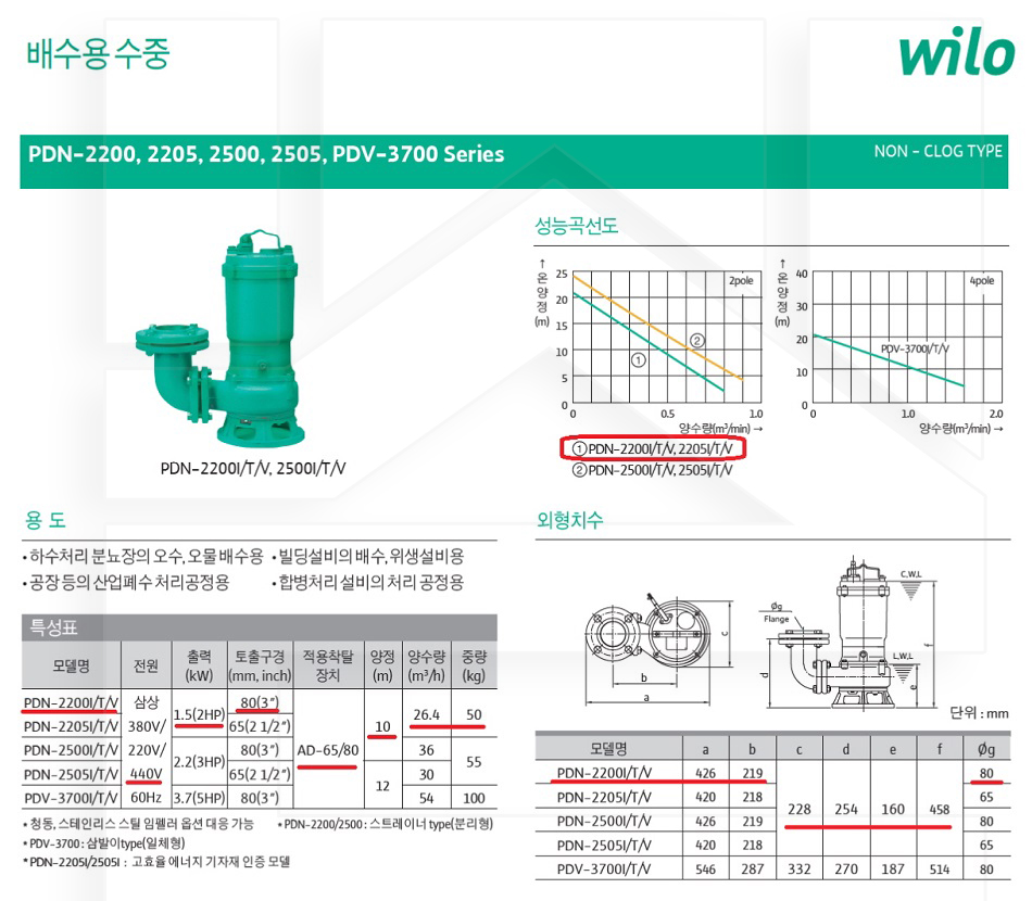 100-65-15-00002200 오수비자동 삼상440 PDN-2200V 판매가 698,000 ~ 원 배송방법 일반배송 브랜드 제조사 윌로펌프 주식회사 상품옵션 품명 옵션코드 규격 중량 판매단위 회원가 수량 PDN-2200V 100-65-15-00002200 80A 50.0kg (50,000g) 0 698,000원 - + PDN-2500V 100-65-15-00002500 80A 55.0kg (55,000g) 0 765,000원 - + PDN-5500V 100-65-15-00005500 100A 130.0kg (130,000g) 0 1,902,000원 - + PDN-7500V 100-65-15-00007500 100A 131.0kg (131,000g) 0 2,054,000원 - + 총 상품 금액(VAT포함) 원 회원 / 비회원 구매하기 상품담기 제품상세정보 상품문의 (0) 배송 안내 반품/교환 안내 배수용 수중 펌프 논클로그형 상품 문의하기 배송안내 배송 안내 일반제품 당일 1시 이전 주문시 재고 여부에 따라 당일발송 재고 부족시 2~3일 소요 파손위험제품 (화물택배/차량배송) 파손위험이 큰 제품은 빠렛트로 포장되어 차량으로 이동됩니다. 고객님이 지정한 장소와 가장 가까운 차량접근이 가능한 도로까지만 배송 주문물량 및 제품의 특성에 따라 화물, 화물택배. 합짐차량. 단독차량으로 고객님의 요청에 따라 운송 차량 지정 제품 하차시 파손이 있을 수 있으므로, 꼭 하차전 제품을 확인 고객센터 고객 센터 010-6539-7900 상담시간 오전 09시 ~ 오후 6시 점심 : 12:00 ~ 13:00 / 휴일 : 토, 일요일, 공휴일 반품/교환 안내 제품의 하자 및 오배송은 문의 주시면 즉시 처리해드리겠습니다. 반품/교환 판매자 지정택배사 : CJ대한통운 반품배송비(편도) : 3,000원 교환배송비(왕복) : 6,000원 보내실 곳 : 전라북도 전주시 완산구 콩쥐팥쥐로 1570 * 반품/교환 사유에 따른 요청 가능 기간 구매자 단순 변심 : 상품수령후 7일이내(구매자 반품 배송비 부담) 반품/교환 불가능 사유 교환/반품 요청 기간이 지난 경우 소비자의 책임 있는 사유로 상품 등이 분실/파손/훼손된 경우 소비자의 사용/소비에 의해 상품 등의 가치가 현저히 감소한 경우 제품을 설치 또는 장착하였을 경우 주문제작 상품중 상품제작에 들어간 경우 제품을 하차 또는 시공 후의 공정과정에서 일어난 파손의 경우 교환 반품시 고객 부담 배송비를 지불하지 아니한 경우 * 펌프제품은 미사용, 포장박스 미훼손 시에만 교환/반품이 가능합니다. 고객센터 고객 센터 010-6539-7900 상담시간 오전 09시 ~ 오후 6시 점심 : 12:00 ~ 13:00 / 휴일 : 토, 일요일, 공휴일