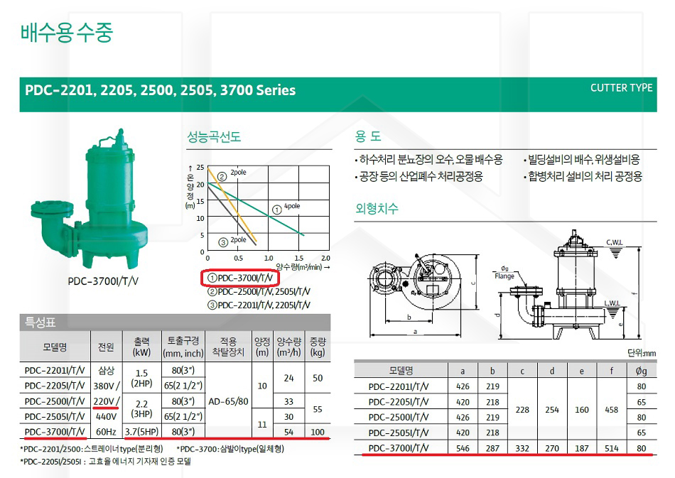 100-66-11-00003700 오수펌프커터 삼상220 PDC-3700T 판매가 1,349,000 ~ 원 배송방법 일반배송 브랜드 제조사 윌로펌프 주식회사 상품옵션 품명 옵션코드 규격 중량 판매단위 회원가 수량 PDC-2201T 100-66-11-00002201 80A 50.0kg (50,000g) 0 783,000원 - + PDC-2500T 100-66-11-00002500 80A 55.0kg (55,000g) 0 864,000원 - + PDC-3700T 100-66-11-00003700 80A 100.0kg (100,000g) 0 1,349,000원 - + 총 상품 금액(VAT포함) 원 회원 / 비회원 구매하기 상품담기 제품상세정보 상품문의 (0) 배송 안내 반품/교환 안내 배수용 수중 펌프 컷터형 상품 문의하기 배송안내 배송 안내 일반제품 당일 1시 이전 주문시 재고 여부에 따라 당일발송 재고 부족시 2~3일 소요 파손위험제품 (화물택배/차량배송) 파손위험이 큰 제품은 빠렛트로 포장되어 차량으로 이동됩니다. 고객님이 지정한 장소와 가장 가까운 차량접근이 가능한 도로까지만 배송 주문물량 및 제품의 특성에 따라 화물, 화물택배. 합짐차량. 단독차량으로 고객님의 요청에 따라 운송 차량 지정 제품 하차시 파손이 있을 수 있으므로, 꼭 하차전 제품을 확인 고객센터 고객 센터 010-6539-7900 상담시간 오전 09시 ~ 오후 6시 점심 : 12:00 ~ 13:00 / 휴일 : 토, 일요일, 공휴일 반품/교환 안내 제품의 하자 및 오배송은 문의 주시면 즉시 처리해드리겠습니다. 반품/교환 판매자 지정택배사 : CJ대한통운 반품배송비(편도) : 3,000원 교환배송비(왕복) : 6,000원 보내실 곳 : 전라북도 전주시 완산구 콩쥐팥쥐로 1570 * 반품/교환 사유에 따른 요청 가능 기간 구매자 단순 변심 : 상품수령후 7일이내(구매자 반품 배송비 부담) 반품/교환 불가능 사유 교환/반품 요청 기간이 지난 경우 소비자의 책임 있는 사유로 상품 등이 분실/파손/훼손된 경우 소비자의 사용/소비에 의해 상품 등의 가치가 현저히 감소한 경우 제품을 설치 또는 장착하였을 경우 주문제작 상품중 상품제작에 들어간 경우 제품을 하차 또는 시공 후의 공정과정에서 일어난 파손의 경우 교환 반품시 고객 부담 배송비를 지불하지 아니한 경우 * 펌프제품은 미사용, 포장박스 미훼손 시에만 교환/반품이 가능합니다. 고객센터 고객 센터 010-6539-7900 상담시간 오전 09시 ~ 오후 6시 점심 : 12:00 ~ 13:00 / 휴일 : 토, 일요일, 공휴일