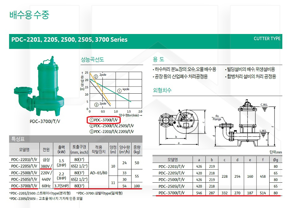 100-66-12-00003700 오수펌프커터 삼상330 PDC-3700I 판매가 1,349,000 ~ 원 배송방법 일반배송 브랜드 제조사 윌로펌프 주식회사 상품옵션 품명 옵션코드 규격 중량 판매단위 회원가 수량 PDC-2201I 100-66-12-00002201 80A 50.0kg (50,000g) 0 783,000원 - + PDC-2500I 100-66-12-00002500 80A 55.0kg (55,000g) 0 864,000원 - + PDC-3700I 100-66-12-00003700 80A 100.0kg (100,000g) 0 1,349,000원 - + 총 상품 금액(VAT포함) 원 회원 / 비회원 구매하기 상품담기 제품상세정보 상품문의 (0) 배송 안내 반품/교환 안내 배수용 수중 펌프 컷터형 상품 문의하기 배송안내 배송 안내 일반제품 당일 1시 이전 주문시 재고 여부에 따라 당일발송 재고 부족시 2~3일 소요 파손위험제품 (화물택배/차량배송) 파손위험이 큰 제품은 빠렛트로 포장되어 차량으로 이동됩니다. 고객님이 지정한 장소와 가장 가까운 차량접근이 가능한 도로까지만 배송 주문물량 및 제품의 특성에 따라 화물, 화물택배. 합짐차량. 단독차량으로 고객님의 요청에 따라 운송 차량 지정 제품 하차시 파손이 있을 수 있으므로, 꼭 하차전 제품을 확인 고객센터 고객 센터 010-6539-7900 상담시간 오전 09시 ~ 오후 6시 점심 : 12:00 ~ 13:00 / 휴일 : 토, 일요일, 공휴일 반품/교환 안내 제품의 하자 및 오배송은 문의 주시면 즉시 처리해드리겠습니다. 반품/교환 판매자 지정택배사 : CJ대한통운 반품배송비(편도) : 3,000원 교환배송비(왕복) : 6,000원 보내실 곳 : 전라북도 전주시 완산구 콩쥐팥쥐로 1570 * 반품/교환 사유에 따른 요청 가능 기간 구매자 단순 변심 : 상품수령후 7일이내(구매자 반품 배송비 부담) 반품/교환 불가능 사유 교환/반품 요청 기간이 지난 경우 소비자의 책임 있는 사유로 상품 등이 분실/파손/훼손된 경우 소비자의 사용/소비에 의해 상품 등의 가치가 현저히 감소한 경우 제품을 설치 또는 장착하였을 경우 주문제작 상품중 상품제작에 들어간 경우 제품을 하차 또는 시공 후의 공정과정에서 일어난 파손의 경우 교환 반품시 고객 부담 배송비를 지불하지 아니한 경우 * 펌프제품은 미사용, 포장박스 미훼손 시에만 교환/반품이 가능합니다. 고객센터 고객 센터 010-6539-7900 상담시간 오전 09시 ~ 오후 6시 점심 : 12:00 ~ 13:00 / 휴일 : 토, 일요일, 공휴일
