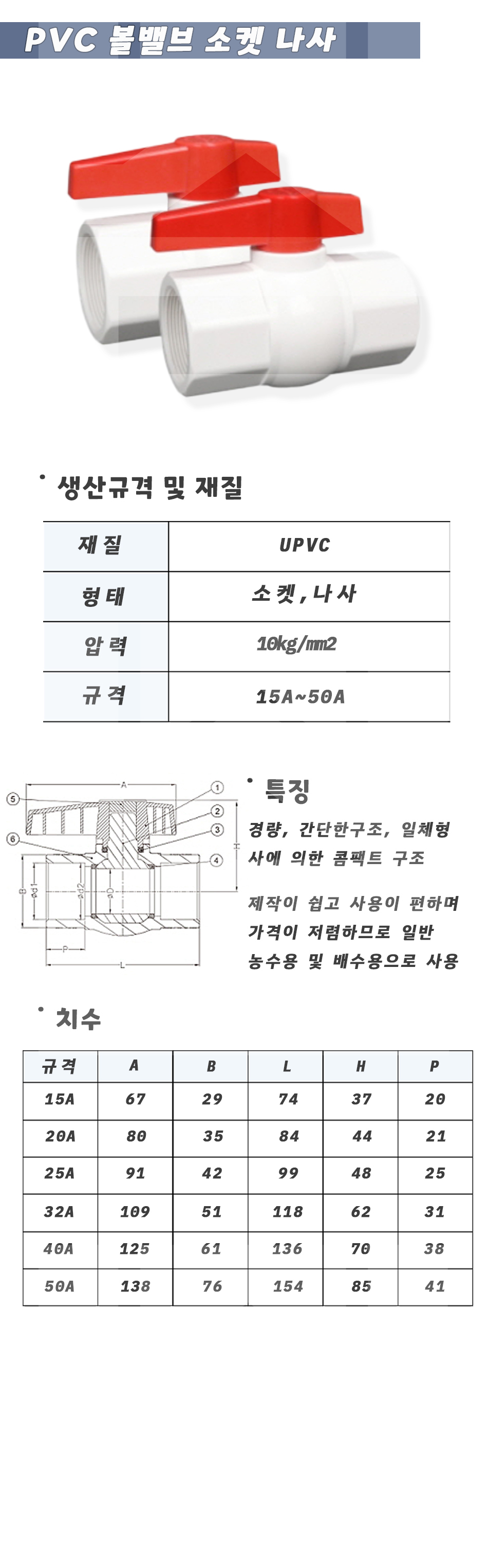 007-21-01-00000015 PVC 볼밸브 나사 판매가 1,240 ~ 원 배송방법 일반배송 브랜드 제조사 상품옵션 품명 옵션코드 규격 중량 판매단위 회원가 수량 PVC 볼밸브 나사 007-21-01-00000015 15A 0.2kg (216g) 0 1,240원 - + PVC 볼밸브 나사 007-21-01-00000020 20A 0.3kg (298g) 0 1,640원 - + PVC 볼밸브 나사 007-21-01-00000025 25A 0.4kg (428g) 0 2,560원 - + PVC 볼밸브 나사 007-21-01-00000030 30A 0.7kg (672g) 0 4,200원 - + PVC 볼밸브 나사 007-21-01-00000040 40A 1.0kg (968g) 0 5,880원 - + PVC 볼밸브 나사 007-21-01-00000050 50A 1.5kg (1,532g) 0 9,240원 - + 총 상품 금액(VAT포함) 원 회원 / 비회원 구매하기 상품담기 제품상세정보 상품문의 (0) 배송 안내 반품/교환 안내 PVC 볼밸브 상품 문의하기 배송안내 배송 안내 일반제품 당일 1시 이전 주문시 재고 여부에 따라 당일발송 재고 부족시 2~3일 소요 파손위험제품 (화물택배/차량배송) 파손위험이 큰 제품은 빠렛트로 포장되어 차량으로 이동됩니다. 고객님이 지정한 장소와 가장 가까운 차량접근이 가능한 도로까지만 배송 주문물량 및 제품의 특성에 따라 화물, 화물택배. 합짐차량. 단독차량으로 고객님의 요청에 따라 운송 차량 지정 제품 하차시 파손이 있을 수 있으므로, 꼭 하차전 제품을 확인 고객센터 고객 센터 010-6539-7900 상담시간 오전 09시 ~ 오후 6시 점심 : 12:00 ~ 13:00 / 휴일 : 토, 일요일, 공휴일 반품/교환 안내 제품의 하자 및 오배송은 문의 주시면 즉시 처리해드리겠습니다. 반품/교환 판매자 지정택배사 : CJ대한통운 반품배송비(편도) : 3,000원 교환배송비(왕복) : 6,000원 보내실 곳 : 전라북도 전주시 완산구 콩쥐팥쥐로 1570 * 반품/교환 사유에 따른 요청 가능 기간 구매자 단순 변심 : 상품수령후 7일이내(구매자 반품 배송비 부담) 반품/교환 불가능 사유 교환/반품 요청 기간이 지난 경우 소비자의 책임 있는 사유로 상품 등이 분실/파손/훼손된 경우 소비자의 사용/소비에 의해 상품 등의 가치가 현저히 감소한 경우 제품을 설치 또는 장착하였을 경우 주문제작 상품중 상품제작에 들어간 경우 제품을 하차 또는 시공 후의 공정과정에서 일어난 파손의 경우 교환 반품시 고객 부담 배송비를 지불하지 아니한 경우 * 펌프제품은 미사용, 포장박스 미훼손 시에만 교환/반품이 가능합니다. 고객센터 고객 센터 010-6539-7900 상담시간 오전 09시 ~ 오후 6시 점심 : 12:00 ~ 13:00 / 휴일 : 토, 일요일, 공휴일