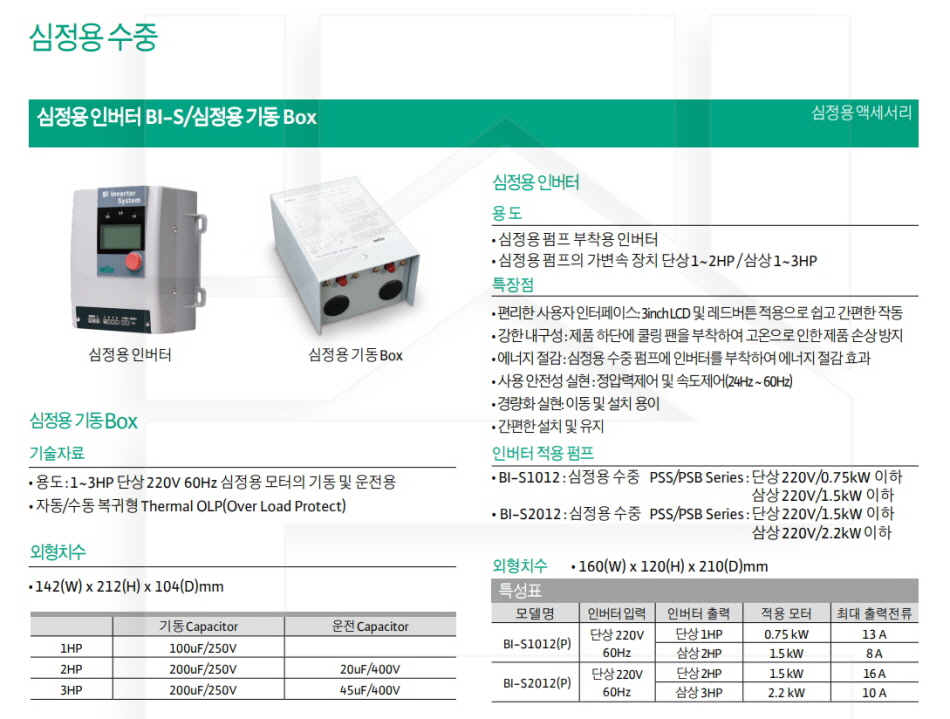 101-14-13-00002012 심정용인버터단상 BI-S2012P 판매가 702,000 ~ 원 배송방법 일반배송 브랜드 제조사 윌로펌프 주식회사 상품옵션 품명 옵션코드 규격 중량 판매단위 회원가 수량 BI-S1012P 101-14-13-00001012 0.0kg (0g) 0 640,000원 - + BI-S2012P 101-14-13-00002012 0.0kg (0g) 0 702,000원 - + 총 상품 금액(VAT포함) 원 회원 / 비회원 구매하기 상품담기 제품상세정보 상품문의 (0) 배송 안내 반품/교환 안내 심정용 수중 펌프 인버터 액세서리 상품 문의하기 배송안내 배송 안내 일반제품 당일 1시 이전 주문시 재고 여부에 따라 당일발송 재고 부족시 2~3일 소요 파손위험제품 (화물택배/차량배송) 파손위험이 큰 제품은 빠렛트로 포장되어 차량으로 이동됩니다. 고객님이 지정한 장소와 가장 가까운 차량접근이 가능한 도로까지만 배송 주문물량 및 제품의 특성에 따라 화물, 화물택배. 합짐차량. 단독차량으로 고객님의 요청에 따라 운송 차량 지정 제품 하차시 파손이 있을 수 있으므로, 꼭 하차전 제품을 확인 고객센터 고객 센터 010-6539-7900 상담시간 오전 09시 ~ 오후 6시 점심 : 12:00 ~ 13:00 / 휴일 : 토, 일요일, 공휴일 반품/교환 안내 제품의 하자 및 오배송은 문의 주시면 즉시 처리해드리겠습니다. 반품/교환 판매자 지정택배사 : CJ대한통운 반품배송비(편도) : 3,000원 교환배송비(왕복) : 6,000원 보내실 곳 : 전라북도 전주시 완산구 콩쥐팥쥐로 1570 * 반품/교환 사유에 따른 요청 가능 기간 구매자 단순 변심 : 상품수령후 7일이내(구매자 반품 배송비 부담) 반품/교환 불가능 사유 교환/반품 요청 기간이 지난 경우 소비자의 책임 있는 사유로 상품 등이 분실/파손/훼손된 경우 소비자의 사용/소비에 의해 상품 등의 가치가 현저히 감소한 경우 제품을 설치 또는 장착하였을 경우 주문제작 상품중 상품제작에 들어간 경우 제품을 하차 또는 시공 후의 공정과정에서 일어난 파손의 경우 교환 반품시 고객 부담 배송비를 지불하지 아니한 경우 * 펌프제품은 미사용, 포장박스 미훼손 시에만 교환/반품이 가능합니다. 고객센터 고객 센터 010-6539-7900 상담시간 오전 09시 ~ 오후 6시 점심 : 12:00 ~ 13:00 / 휴일 : 토, 일요일, 공휴일