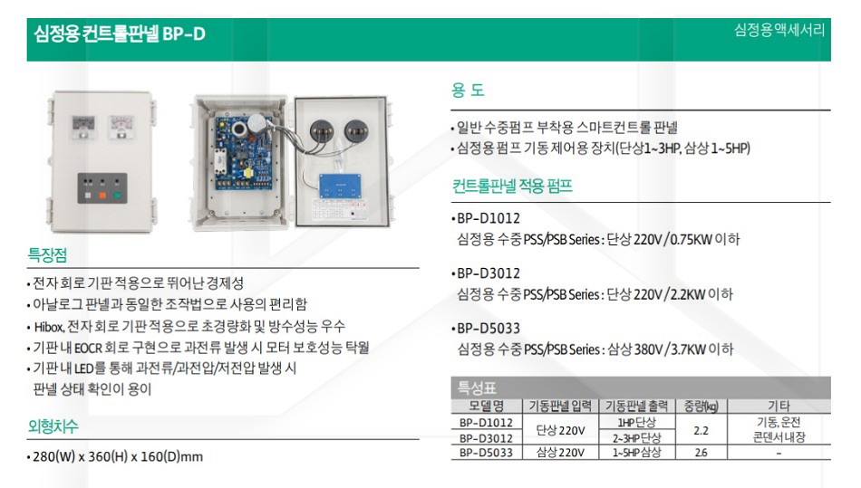 101-14-16-00001012 심정용컨트롤판넬 BP-D1012 판매가 149,000 ~ 원 배송방법 일반배송 브랜드 제조사 윌로펌프 주식회사 상품옵션 품명 옵션코드 규격 중량 판매단위 회원가 수량 BP-D1012 101-14-16-00001012 2.2kg (2,200g) 0 149,000원 - + BP-D3012 101-14-16-00003012 2.2kg (2,200g) 0 176,000원 - + BP-D5033 101-14-16-00005033 2.6kg (2,600g) 0 199,000원 - + 총 상품 금액(VAT포함) 원 회원 / 비회원 구매하기 상품담기 제품상세정보 상품문의 (0) 배송 안내 반품/교환 안내 심정용 수중 펌프 컨트롤판넬 액세서리 상품 문의하기 배송안내 배송 안내 일반제품 당일 1시 이전 주문시 재고 여부에 따라 당일발송 재고 부족시 2~3일 소요 파손위험제품 (화물택배/차량배송) 파손위험이 큰 제품은 빠렛트로 포장되어 차량으로 이동됩니다. 고객님이 지정한 장소와 가장 가까운 차량접근이 가능한 도로까지만 배송 주문물량 및 제품의 특성에 따라 화물, 화물택배. 합짐차량. 단독차량으로 고객님의 요청에 따라 운송 차량 지정 제품 하차시 파손이 있을 수 있으므로, 꼭 하차전 제품을 확인 고객센터 고객 센터 010-6539-7900 상담시간 오전 09시 ~ 오후 6시 점심 : 12:00 ~ 13:00 / 휴일 : 토, 일요일, 공휴일 반품/교환 안내 제품의 하자 및 오배송은 문의 주시면 즉시 처리해드리겠습니다. 반품/교환 판매자 지정택배사 : CJ대한통운 반품배송비(편도) : 3,000원 교환배송비(왕복) : 6,000원 보내실 곳 : 전라북도 전주시 완산구 콩쥐팥쥐로 1570 * 반품/교환 사유에 따른 요청 가능 기간 구매자 단순 변심 : 상품수령후 7일이내(구매자 반품 배송비 부담) 반품/교환 불가능 사유 교환/반품 요청 기간이 지난 경우 소비자의 책임 있는 사유로 상품 등이 분실/파손/훼손된 경우 소비자의 사용/소비에 의해 상품 등의 가치가 현저히 감소한 경우 제품을 설치 또는 장착하였을 경우 주문제작 상품중 상품제작에 들어간 경우 제품을 하차 또는 시공 후의 공정과정에서 일어난 파손의 경우 교환 반품시 고객 부담 배송비를 지불하지 아니한 경우 * 펌프제품은 미사용, 포장박스 미훼손 시에만 교환/반품이 가능합니다. 고객센터 고객 센터 010-6539-7900 상담시간 오전 09시 ~ 오후 6시 점심 : 12:00 ~ 13:00 / 휴일 : 토, 일요일, 공휴일