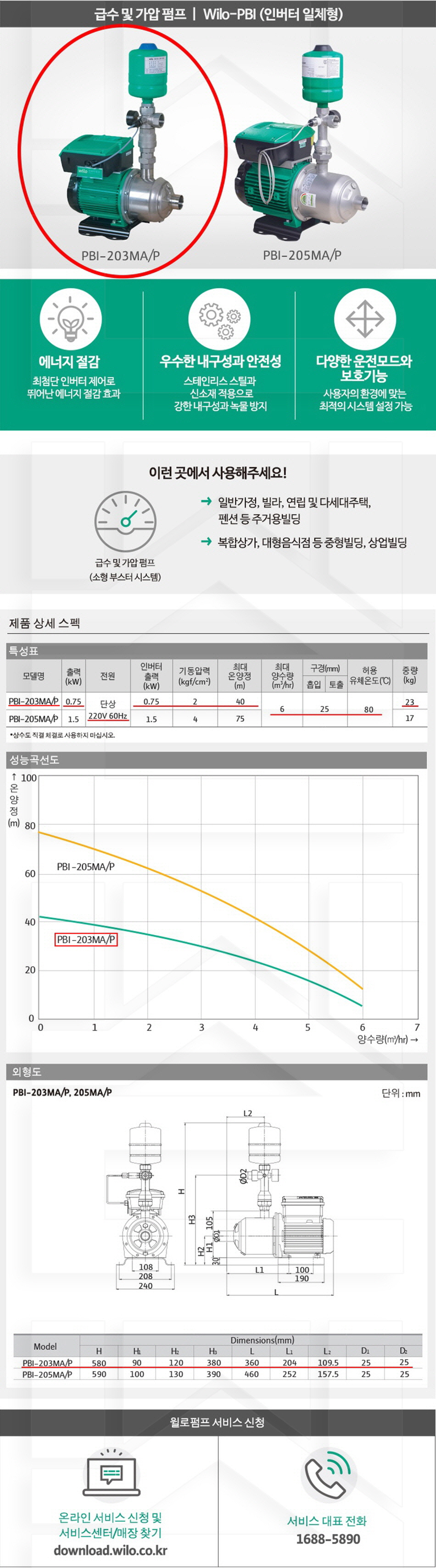 101-32-11-00000203 인버터 일체형펌프 PBI시리즈 PBI-203MA/P(0.75W) 판매가 1,331,000 ~ 원 배송방법 일반배송 브랜드 제조사 윌로펌프 주식회사 상품옵션 품명 옵션코드 규격 중량 판매단위 회원가 수량 PBI-203MA/P(0.75W) 101-32-11-00000203 25A 23.0kg (23,000g) 0 1,331,000원 - + PBI-205MA/P(1.1W) 101-32-11-00000205 25A 17.0kg (17,000g) 0 1,430,000원 - + PBI-402MA/P(0.75W) 101-32-11-00000402 32/25A 22.0kg (22,000g) 0 1,331,000원 - + PBI-403MA/P(1.1W) 101-32-11-00000403 32/25A 24.0kg (24,000g) 0 1,430,000원 - + PBI-404MA/P(1.5W) 101-32-11-00000404 32/25A 26.0kg (26,000g) 0 1,510,000원 - + PBI-405MA/P(1.85W) 101-32-11-00000405 32/25A 27.0kg (27,000g) 0 1,787,000원 - + PBI-406UA/P(2.2W) 101-32-11-00000406 32/25A 29.0kg (29,000g) 0 2,436,000원 - + PBI-802MA/P(1.5W) 101-32-11-00000802 40/32A 27.0kg (27,000g) 0 1,701,000원 - + PBI-803MA/P(1.85W) 101-32-11-00000803 40/32A 29.0kg (29,000g) 0 1,933,000원 - + PBI-804UA/P(2.5W) 101-32-11-00000804 40/32A 31.0kg (31,000g) 0 2,436,000원 - + 총 상품 금액(VAT포함) 원 회원 / 비회원 구매하기 상품담기 제품상세정보 상품문의 (0) 배송 안내 반품/교환 안내 급수 가압 펌프 인버터 일체형 상품 문의하기 배송안내 배송 안내 일반제품 당일 1시 이전 주문시 재고 여부에 따라 당일발송 재고 부족시 2~3일 소요 파손위험제품 (화물택배/차량배송) 파손위험이 큰 제품은 빠렛트로 포장되어 차량으로 이동됩니다. 고객님이 지정한 장소와 가장 가까운 차량접근이 가능한 도로까지만 배송 주문물량 및 제품의 특성에 따라 화물, 화물택배. 합짐차량. 단독차량으로 고객님의 요청에 따라 운송 차량 지정 제품 하차시 파손이 있을 수 있으므로, 꼭 하차전 제품을 확인 고객센터 고객 센터 010-6539-7900 상담시간 오전 09시 ~ 오후 6시 점심 : 12:00 ~ 13:00 / 휴일 : 토, 일요일, 공휴일 반품/교환 안내 제품의 하자 및 오배송은 문의 주시면 즉시 처리해드리겠습니다. 반품/교환 판매자 지정택배사 : CJ대한통운 반품배송비(편도) : 3,000원 교환배송비(왕복) : 6,000원 보내실 곳 : 전라북도 전주시 완산구 콩쥐팥쥐로 1570 * 반품/교환 사유에 따른 요청 가능 기간 구매자 단순 변심 : 상품수령후 7일이내(구매자 반품 배송비 부담) 반품/교환 불가능 사유 교환/반품 요청 기간이 지난 경우 소비자의 책임 있는 사유로 상품 등이 분실/파손/훼손된 경우 소비자의 사용/소비에 의해 상품 등의 가치가 현저히 감소한 경우 제품을 설치 또는 장착하였을 경우 주문제작 상품중 상품제작에 들어간 경우 제품을 하차 또는 시공 후의 공정과정에서 일어난 파손의 경우 교환 반품시 고객 부담 배송비를 지불하지 아니한 경우 * 펌프제품은 미사용, 포장박스 미훼손 시에만 교환/반품이 가능합니다. 고객센터 고객 센터 010-6539-7900 상담시간 오전 09시 ~ 오후 6시 점심 : 12:00 ~ 13:00 / 휴일 : 토, 일요일, 공휴일