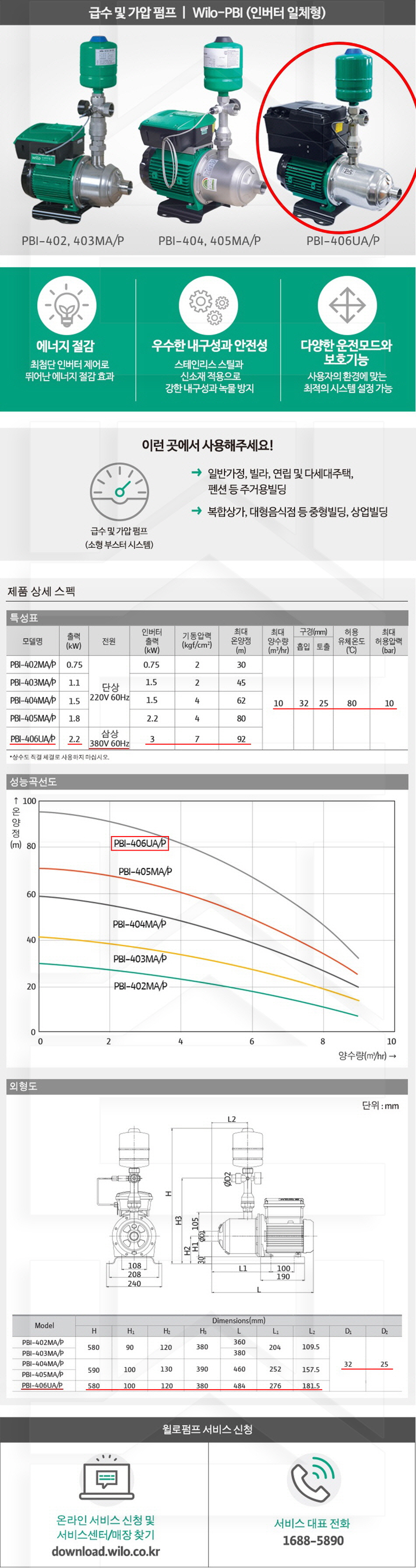 101-32-11-00000406 인버터 일체형펌프 PBI시리즈 PBI-406UA/P(2.2W) 판매가 2,436,000 ~ 원 배송방법 일반배송 브랜드 제조사 윌로펌프 주식회사 상품옵션 품명 옵션코드 규격 중량 판매단위 회원가 수량 PBI-203MA/P(0.75W) 101-32-11-00000203 25A 23.0kg (23,000g) 0 1,331,000원 - + PBI-205MA/P(1.1W) 101-32-11-00000205 25A 17.0kg (17,000g) 0 1,430,000원 - + PBI-402MA/P(0.75W) 101-32-11-00000402 32/25A 22.0kg (22,000g) 0 1,331,000원 - + PBI-403MA/P(1.1W) 101-32-11-00000403 32/25A 24.0kg (24,000g) 0 1,430,000원 - + PBI-404MA/P(1.5W) 101-32-11-00000404 32/25A 26.0kg (26,000g) 0 1,510,000원 - + PBI-405MA/P(1.85W) 101-32-11-00000405 32/25A 27.0kg (27,000g) 0 1,787,000원 - + PBI-406UA/P(2.2W) 101-32-11-00000406 32/25A 29.0kg (29,000g) 0 2,436,000원 - + PBI-802MA/P(1.5W) 101-32-11-00000802 40/32A 27.0kg (27,000g) 0 1,701,000원 - + PBI-803MA/P(1.85W) 101-32-11-00000803 40/32A 29.0kg (29,000g) 0 1,933,000원 - + PBI-804UA/P(2.5W) 101-32-11-00000804 40/32A 31.0kg (31,000g) 0 2,436,000원 - + 총 상품 금액(VAT포함) 원 회원 / 비회원 구매하기 상품담기 제품상세정보 상품문의 (0) 배송 안내 반품/교환 안내 급수 가압펌프 인버터일체형 상품 문의하기 배송안내 배송 안내 일반제품 당일 1시 이전 주문시 재고 여부에 따라 당일발송 재고 부족시 2~3일 소요 파손위험제품 (화물택배/차량배송) 파손위험이 큰 제품은 빠렛트로 포장되어 차량으로 이동됩니다. 고객님이 지정한 장소와 가장 가까운 차량접근이 가능한 도로까지만 배송 주문물량 및 제품의 특성에 따라 화물, 화물택배. 합짐차량. 단독차량으로 고객님의 요청에 따라 운송 차량 지정 제품 하차시 파손이 있을 수 있으므로, 꼭 하차전 제품을 확인 고객센터 고객 센터 010-6539-7900 상담시간 오전 09시 ~ 오후 6시 점심 : 12:00 ~ 13:00 / 휴일 : 토, 일요일, 공휴일 반품/교환 안내 제품의 하자 및 오배송은 문의 주시면 즉시 처리해드리겠습니다. 반품/교환 판매자 지정택배사 : CJ대한통운 반품배송비(편도) : 3,000원 교환배송비(왕복) : 6,000원 보내실 곳 : 전라북도 전주시 완산구 콩쥐팥쥐로 1570 * 반품/교환 사유에 따른 요청 가능 기간 구매자 단순 변심 : 상품수령후 7일이내(구매자 반품 배송비 부담) 반품/교환 불가능 사유 교환/반품 요청 기간이 지난 경우 소비자의 책임 있는 사유로 상품 등이 분실/파손/훼손된 경우 소비자의 사용/소비에 의해 상품 등의 가치가 현저히 감소한 경우 제품을 설치 또는 장착하였을 경우 주문제작 상품중 상품제작에 들어간 경우 제품을 하차 또는 시공 후의 공정과정에서 일어난 파손의 경우 교환 반품시 고객 부담 배송비를 지불하지 아니한 경우 * 펌프제품은 미사용, 포장박스 미훼손 시에만 교환/반품이 가능합니다. 고객센터 고객 센터 010-6539-7900 상담시간 오전 09시 ~ 오후 6시 점심 : 12:00 ~ 13:00 / 휴일 : 토, 일요일, 공휴일