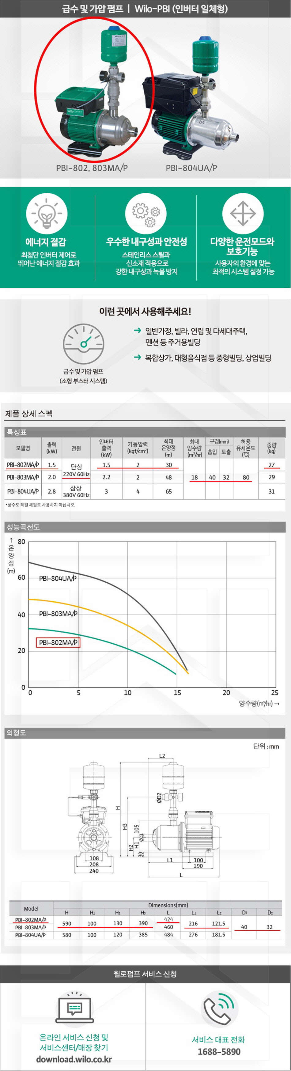 101-32-11-00000802 인버터 일체형펌프 PBI시리즈 PBI-802MA/P(1.5W) 판매가 1,701,000 ~ 원 배송방법 일반배송 브랜드 제조사 윌로펌프 주식회사 상품옵션 품명 옵션코드 규격 중량 판매단위 회원가 수량 PBI-203MA/P(0.75W) 101-32-11-00000203 25A 23.0kg (23,000g) 0 1,331,000원 - + PBI-205MA/P(1.1W) 101-32-11-00000205 25A 17.0kg (17,000g) 0 1,430,000원 - + PBI-402MA/P(0.75W) 101-32-11-00000402 32/25A 22.0kg (22,000g) 0 1,331,000원 - + PBI-403MA/P(1.1W) 101-32-11-00000403 32/25A 24.0kg (24,000g) 0 1,430,000원 - + PBI-404MA/P(1.5W) 101-32-11-00000404 32/25A 26.0kg (26,000g) 0 1,510,000원 - + PBI-405MA/P(1.85W) 101-32-11-00000405 32/25A 27.0kg (27,000g) 0 1,787,000원 - + PBI-406UA/P(2.2W) 101-32-11-00000406 32/25A 29.0kg (29,000g) 0 2,436,000원 - + PBI-802MA/P(1.5W) 101-32-11-00000802 40/32A 27.0kg (27,000g) 0 1,701,000원 - + PBI-803MA/P(1.85W) 101-32-11-00000803 40/32A 29.0kg (29,000g) 0 1,933,000원 - + PBI-804UA/P(2.5W) 101-32-11-00000804 40/32A 31.0kg (31,000g) 0 2,436,000원 - + 총 상품 금액(VAT포함) 원 회원 / 비회원 구매하기 상품담기 제품상세정보 상품문의 (0) 배송 안내 반품/교환 안내 급수 가압 펌프 인버터 일체형 상품 문의하기 배송안내 배송 안내 일반제품 당일 1시 이전 주문시 재고 여부에 따라 당일발송 재고 부족시 2~3일 소요 파손위험제품 (화물택배/차량배송) 파손위험이 큰 제품은 빠렛트로 포장되어 차량으로 이동됩니다. 고객님이 지정한 장소와 가장 가까운 차량접근이 가능한 도로까지만 배송 주문물량 및 제품의 특성에 따라 화물, 화물택배. 합짐차량. 단독차량으로 고객님의 요청에 따라 운송 차량 지정 제품 하차시 파손이 있을 수 있으므로, 꼭 하차전 제품을 확인 고객센터 고객 센터 010-6539-7900 상담시간 오전 09시 ~ 오후 6시 점심 : 12:00 ~ 13:00 / 휴일 : 토, 일요일, 공휴일 반품/교환 안내 제품의 하자 및 오배송은 문의 주시면 즉시 처리해드리겠습니다. 반품/교환 판매자 지정택배사 : CJ대한통운 반품배송비(편도) : 3,000원 교환배송비(왕복) : 6,000원 보내실 곳 : 전라북도 전주시 완산구 콩쥐팥쥐로 1570 * 반품/교환 사유에 따른 요청 가능 기간 구매자 단순 변심 : 상품수령후 7일이내(구매자 반품 배송비 부담) 반품/교환 불가능 사유 교환/반품 요청 기간이 지난 경우 소비자의 책임 있는 사유로 상품 등이 분실/파손/훼손된 경우 소비자의 사용/소비에 의해 상품 등의 가치가 현저히 감소한 경우 제품을 설치 또는 장착하였을 경우 주문제작 상품중 상품제작에 들어간 경우 제품을 하차 또는 시공 후의 공정과정에서 일어난 파손의 경우 교환 반품시 고객 부담 배송비를 지불하지 아니한 경우 * 펌프제품은 미사용, 포장박스 미훼손 시에만 교환/반품이 가능합니다. 고객센터 고객 센터 010-6539-7900 상담시간 오전 09시 ~ 오후 6시 점심 : 12:00 ~ 13:00 / 휴일 : 토, 일요일, 공휴일