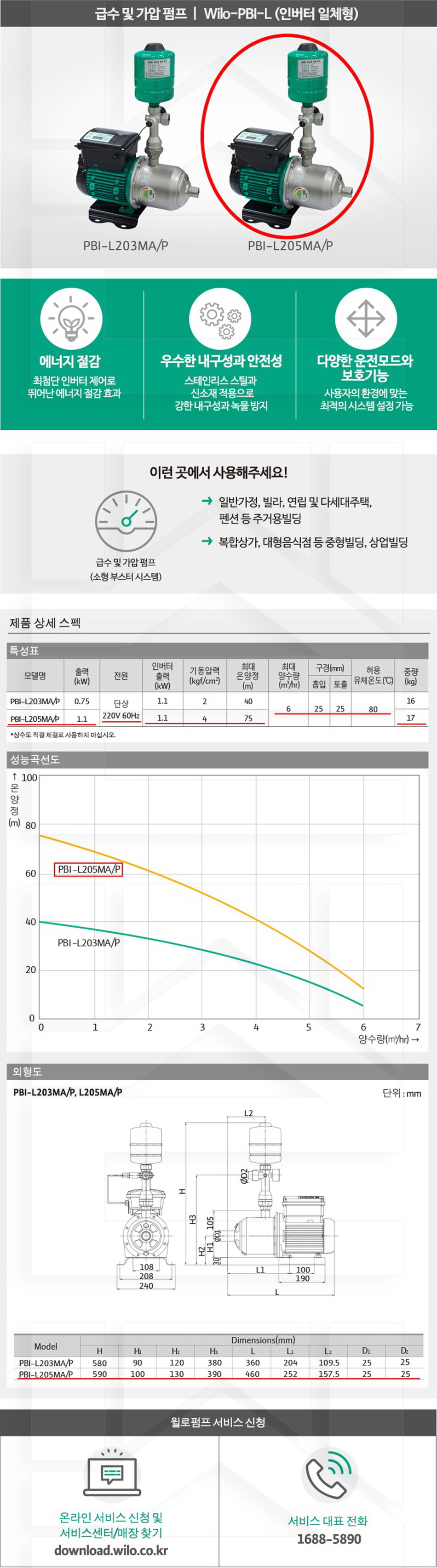 101-32-12-00000205 인버터 일체형펌프 PBI-L시리즈 PBI-L205MA/P(1.1W) 판매가 1,098,000 ~ 원 배송방법 일반배송 브랜드 제조사 윌로펌프 주식회사 상품옵션 품명 옵션코드 규격 중량 판매단위 회원가 수량 PBI-L203MA/P (0.75W) 101-32-12-00000203 25A 16.0kg (16,000g) 0 1,016,000원 - + PBI-L205MA/P(1.1W) 101-32-12-00000205 25A 17.0kg (17,000g) 0 1,098,000원 - + PBI-L402MA/P (0.75W) 101-32-12-00000402 32/25A 14.0kg (14,000g) 0 1,016,000원 - + PBI-L403MA/P (1.1W) 101-32-12-00000403 32/25A 18.0kg (18,000g) 0 1,098,000원 - + PBI-L404MA/P (1.5W) 101-32-12-00000404 32/25A 18.0kg (18,000g) 0 1,150,000원 - + PBI-L405MA/P (1.85W) 101-32-12-00000405 32/25A 19.0kg (19,000g) 0 1,361,000원 - + PBI-L802MA/P (1.5W) 101-32-12-00000802 40/32A 19.0kg (19,000g) 0 1,295,000원 - + PBI-L803MA/P (1.85W) 101-32-12-00000803 40/32A 20.0kg (20,000g) 0 1,472,000원 - + 총 상품 금액(VAT포함) 원 회원 / 비회원 구매하기 상품담기 제품상세정보 상품문의 (0) 배송 안내 반품/교환 안내 급수 가압 펌프 인버터 일체형 상품 문의하기 배송안내 배송 안내 일반제품 당일 1시 이전 주문시 재고 여부에 따라 당일발송 재고 부족시 2~3일 소요 파손위험제품 (화물택배/차량배송) 파손위험이 큰 제품은 빠렛트로 포장되어 차량으로 이동됩니다. 고객님이 지정한 장소와 가장 가까운 차량접근이 가능한 도로까지만 배송 주문물량 및 제품의 특성에 따라 화물, 화물택배. 합짐차량. 단독차량으로 고객님의 요청에 따라 운송 차량 지정 제품 하차시 파손이 있을 수 있으므로, 꼭 하차전 제품을 확인 고객센터 고객 센터 010-6539-7900 상담시간 오전 09시 ~ 오후 6시 점심 : 12:00 ~ 13:00 / 휴일 : 토, 일요일, 공휴일 반품/교환 안내 제품의 하자 및 오배송은 문의 주시면 즉시 처리해드리겠습니다. 반품/교환 판매자 지정택배사 : CJ대한통운 반품배송비(편도) : 3,000원 교환배송비(왕복) : 6,000원 보내실 곳 : 전라북도 전주시 완산구 콩쥐팥쥐로 1570 * 반품/교환 사유에 따른 요청 가능 기간 구매자 단순 변심 : 상품수령후 7일이내(구매자 반품 배송비 부담) 반품/교환 불가능 사유 교환/반품 요청 기간이 지난 경우 소비자의 책임 있는 사유로 상품 등이 분실/파손/훼손된 경우 소비자의 사용/소비에 의해 상품 등의 가치가 현저히 감소한 경우 제품을 설치 또는 장착하였을 경우 주문제작 상품중 상품제작에 들어간 경우 제품을 하차 또는 시공 후의 공정과정에서 일어난 파손의 경우 교환 반품시 고객 부담 배송비를 지불하지 아니한 경우 * 펌프제품은 미사용, 포장박스 미훼손 시에만 교환/반품이 가능합니다. 고객센터 고객 센터 010-6539-7900 상담시간 오전 09시 ~ 오후 6시 점심 : 12:00 ~ 13:00 / 휴일 : 토, 일요일, 공휴일