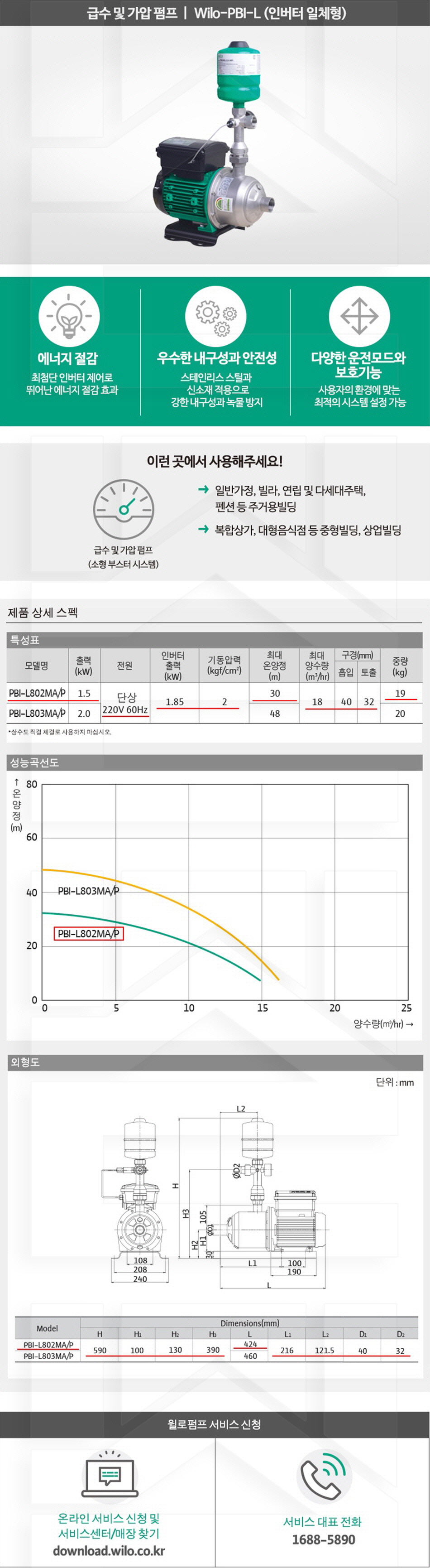 101-32-12-00000802 인버터 일체형펌프 PBI-L시리즈 PBI-L802MA/P (1.5W) 판매가 1,295,000 ~ 원 배송방법 일반배송 브랜드 제조사 윌로펌프 주식회사 상품옵션 품명 옵션코드 규격 중량 판매단위 회원가 수량 PBI-L203MA/P (0.75W) 101-32-12-00000203 25A 16.0kg (16,000g) 0 1,016,000원 - + PBI-L205MA/P(1.1W) 101-32-12-00000205 25A 17.0kg (17,000g) 0 1,098,000원 - + PBI-L402MA/P (0.75W) 101-32-12-00000402 32/25A 14.0kg (14,000g) 0 1,016,000원 - + PBI-L403MA/P (1.1W) 101-32-12-00000403 32/25A 18.0kg (18,000g) 0 1,098,000원 - + PBI-L404MA/P (1.5W) 101-32-12-00000404 32/25A 18.0kg (18,000g) 0 1,150,000원 - + PBI-L405MA/P (1.85W) 101-32-12-00000405 32/25A 19.0kg (19,000g) 0 1,361,000원 - + PBI-L802MA/P (1.5W) 101-32-12-00000802 40/32A 19.0kg (19,000g) 0 1,295,000원 - + PBI-L803MA/P (1.85W) 101-32-12-00000803 40/32A 20.0kg (20,000g) 0 1,472,000원 - + 총 상품 금액(VAT포함) 원 회원 / 비회원 구매하기 상품담기 제품상세정보 상품문의 (0) 배송 안내 반품/교환 안내 급수 가압펌프 인버터 일체형 상품 문의하기 배송안내 배송 안내 일반제품 당일 1시 이전 주문시 재고 여부에 따라 당일발송 재고 부족시 2~3일 소요 파손위험제품 (화물택배/차량배송) 파손위험이 큰 제품은 빠렛트로 포장되어 차량으로 이동됩니다. 고객님이 지정한 장소와 가장 가까운 차량접근이 가능한 도로까지만 배송 주문물량 및 제품의 특성에 따라 화물, 화물택배. 합짐차량. 단독차량으로 고객님의 요청에 따라 운송 차량 지정 제품 하차시 파손이 있을 수 있으므로, 꼭 하차전 제품을 확인 고객센터 고객 센터 010-6539-7900 상담시간 오전 09시 ~ 오후 6시 점심 : 12:00 ~ 13:00 / 휴일 : 토, 일요일, 공휴일 반품/교환 안내 제품의 하자 및 오배송은 문의 주시면 즉시 처리해드리겠습니다. 반품/교환 판매자 지정택배사 : CJ대한통운 반품배송비(편도) : 3,000원 교환배송비(왕복) : 6,000원 보내실 곳 : 전라북도 전주시 완산구 콩쥐팥쥐로 1570 * 반품/교환 사유에 따른 요청 가능 기간 구매자 단순 변심 : 상품수령후 7일이내(구매자 반품 배송비 부담) 반품/교환 불가능 사유 교환/반품 요청 기간이 지난 경우 소비자의 책임 있는 사유로 상품 등이 분실/파손/훼손된 경우 소비자의 사용/소비에 의해 상품 등의 가치가 현저히 감소한 경우 제품을 설치 또는 장착하였을 경우 주문제작 상품중 상품제작에 들어간 경우 제품을 하차 또는 시공 후의 공정과정에서 일어난 파손의 경우 교환 반품시 고객 부담 배송비를 지불하지 아니한 경우 * 펌프제품은 미사용, 포장박스 미훼손 시에만 교환/반품이 가능합니다. 고객센터 고객 센터 010-6539-7900 상담시간 오전 09시 ~ 오후 6시 점심 : 12:00 ~ 13:00 / 휴일 : 토, 일요일, 공휴일