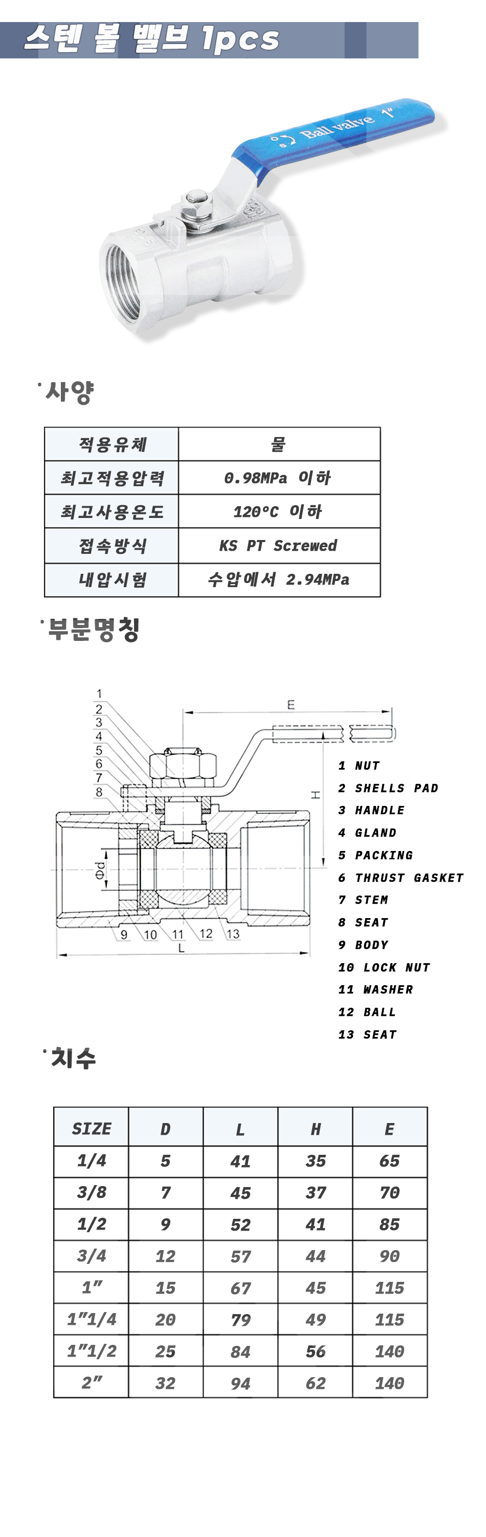 002-22-01-00000032 스텐 볼밸브 1-PCS 판매가 14,100 ~ 원 배송방법 일반배송 브랜드 제조사 상품옵션 품명 옵션코드 규격 중량 판매단위 회원가 수량 스텐 볼밸브 1-PCS 002-22-01-00000015 15A 0.2kg (180g) 0 4,500원 - + 스텐 볼밸브 1-PCS 002-22-01-00000020 20A 0.3kg (260g) 0 6,400원 - + 스텐 볼밸브 1-PCS 002-22-01-00000025 25A 0.4kg (425g) 0 8,700원 - + 스텐 볼밸브 1-PCS 002-22-01-00000032 32A 0.6kg (640g) 0 14,100원 - + 스텐 볼밸브 1-PCS 002-22-01-00000040 40A 0.8kg (792g) 0 19,100원 - + 스텐 볼밸브 1-PCS 002-22-01-00000050 50A 1.2kg (1,227g) 0 28,200원 - + 총 상품 금액(VAT포함) 원 회원 / 비회원 구매하기 상품담기 제품상세정보 상품문의 (0) 배송 안내 반품/교환 안내 스텐 볼밸브 1PCS 상품 문의하기 배송안내 배송 안내 일반제품 당일 1시 이전 주문시 재고 여부에 따라 당일발송 재고 부족시 2~3일 소요 파손위험제품 (화물택배/차량배송) 파손위험이 큰 제품은 빠렛트로 포장되어 차량으로 이동됩니다. 고객님이 지정한 장소와 가장 가까운 차량접근이 가능한 도로까지만 배송 주문물량 및 제품의 특성에 따라 화물, 화물택배. 합짐차량. 단독차량으로 고객님의 요청에 따라 운송 차량 지정 제품 하차시 파손이 있을 수 있으므로, 꼭 하차전 제품을 확인 고객센터 고객 센터 010-6539-7900 상담시간 오전 09시 ~ 오후 6시 점심 : 12:00 ~ 13:00 / 휴일 : 토, 일요일, 공휴일 반품/교환 안내 제품의 하자 및 오배송은 문의 주시면 즉시 처리해드리겠습니다. 반품/교환 판매자 지정택배사 : CJ대한통운 반품배송비(편도) : 3,000원 교환배송비(왕복) : 6,000원 보내실 곳 : 전라북도 전주시 완산구 콩쥐팥쥐로 1570 * 반품/교환 사유에 따른 요청 가능 기간 구매자 단순 변심 : 상품수령후 7일이내(구매자 반품 배송비 부담) 반품/교환 불가능 사유 교환/반품 요청 기간이 지난 경우 소비자의 책임 있는 사유로 상품 등이 분실/파손/훼손된 경우 소비자의 사용/소비에 의해 상품 등의 가치가 현저히 감소한 경우 제품을 설치 또는 장착하였을 경우 주문제작 상품중 상품제작에 들어간 경우 제품을 하차 또는 시공 후의 공정과정에서 일어난 파손의 경우 교환 반품시 고객 부담 배송비를 지불하지 아니한 경우 * 펌프제품은 미사용, 포장박스 미훼손 시에만 교환/반품이 가능합니다. 고객센터 고객 센터 010-6539-7900 상담시간 오전 09시 ~ 오후 6시 점심 : 12:00 ~ 13:00 / 휴일 : 토, 일요일, 공휴일